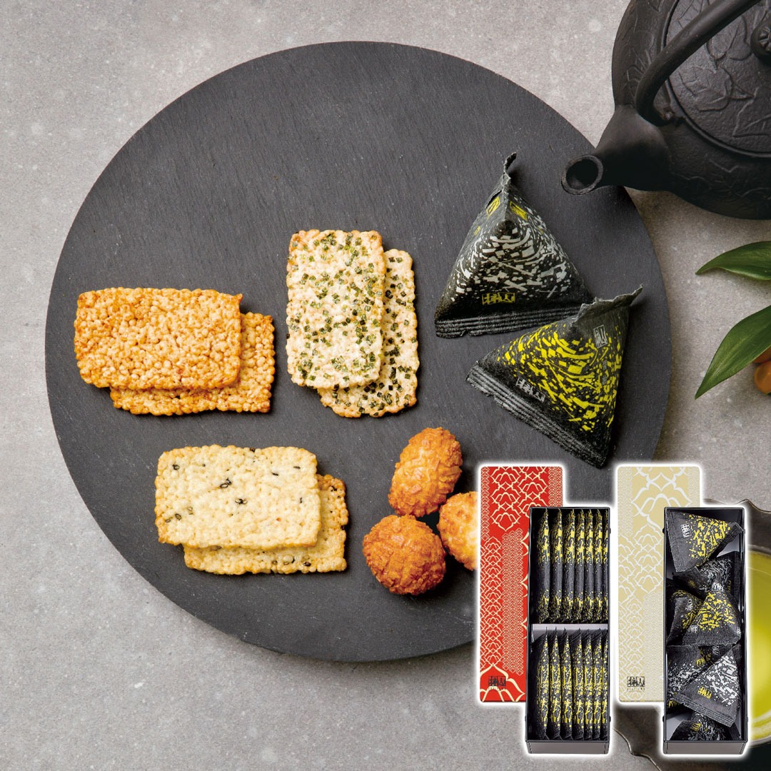 おかきの定番の味「醤油」や「胡麻」、「塩味」が楽しめる紅缶・真珠缶の組み合わせです。