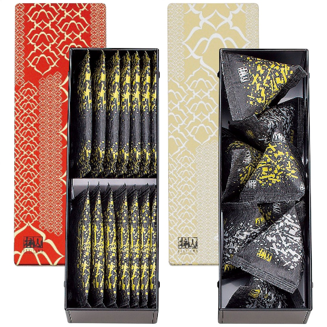 蒔絵の小箱のような風情に仕立てた化粧缶に代表商品の慶長、慶凰を詰合せました。