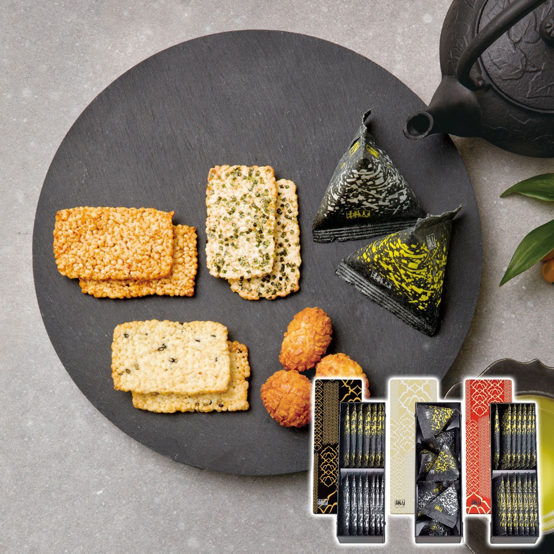 おかきの定番の味「醤油」「海苔」「胡麻」「塩味」が楽しめる3缶入の詰合せです。