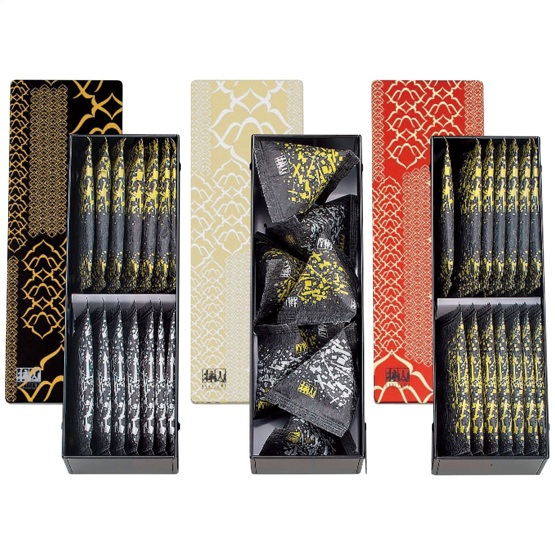 蒔絵の小箱のような風情に仕立てた化粧缶に代表商品の慶長、慶凰を詰合せました。