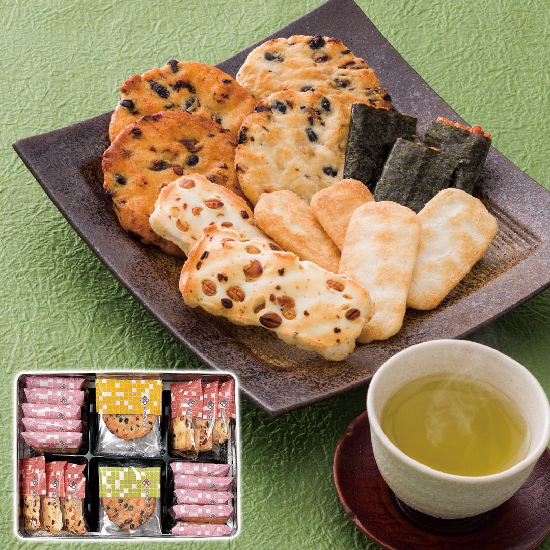 現品サイズ・内容:あまからせん(2枚入)10袋・黒豆醤油せん(1枚入)・黒豆せんべい(1枚入)各3袋・豆おかき(1枚入)6袋