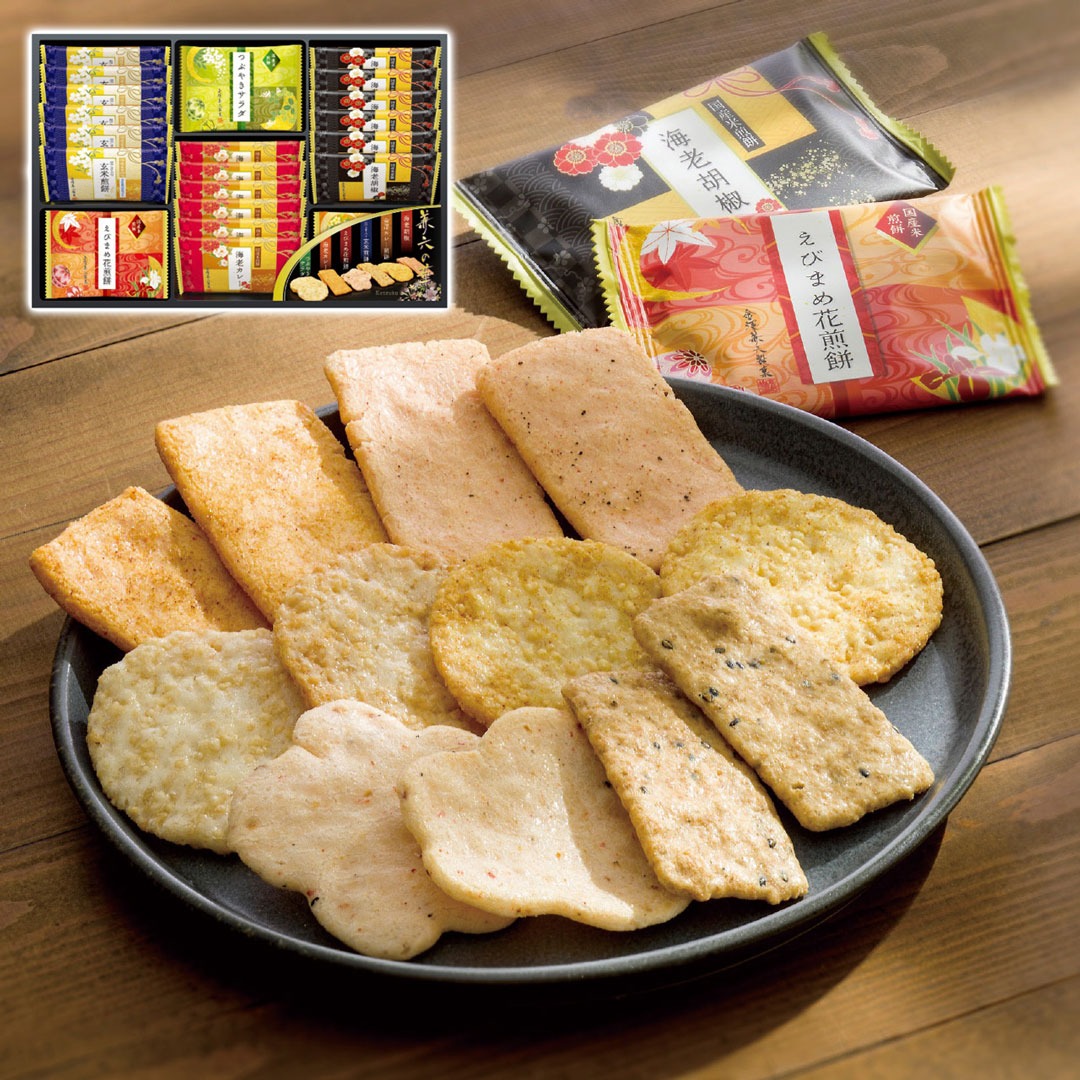 現品サイズ・内容:海老カレー煎餅・黒ごま入り玄米煎餅・海老胡椒煎餅各6枚・えびまめ花煎餅・つぶやきサラダ煎餅・金澤カレー煎餅各3枚