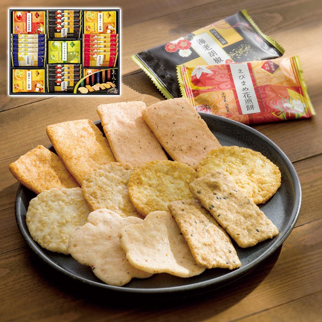 現品サイズ・内容:えびまめ花煎餅・金澤カレー煎餅・海老胡椒煎餅各8枚・海老カレー煎餅・黒ごま入り玄米煎餅各5枚・つぶやきサラダ煎餅4枚
