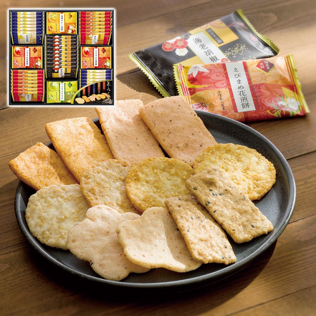 現品サイズ・内容:海老カレー煎餅・黒ごま入り玄米煎餅各14枚・えびまめ花煎餅10枚・海老胡椒煎餅9枚・つぶやきサラダ煎餅・金澤カレー煎餅各5枚