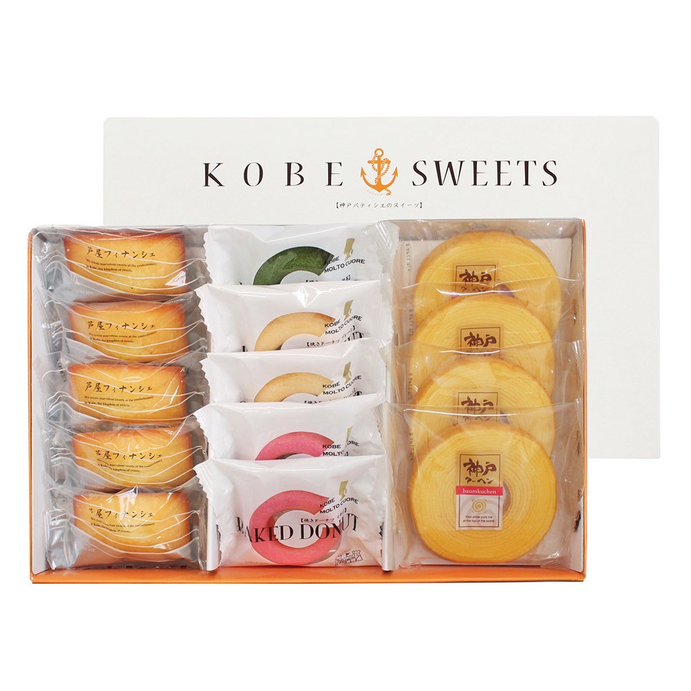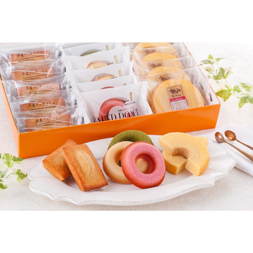 内容量:神戸クーヘン×4、焼きドーナツ(プレーン・いちご×各2、抹茶×1)、芦屋フィナンシェ×5