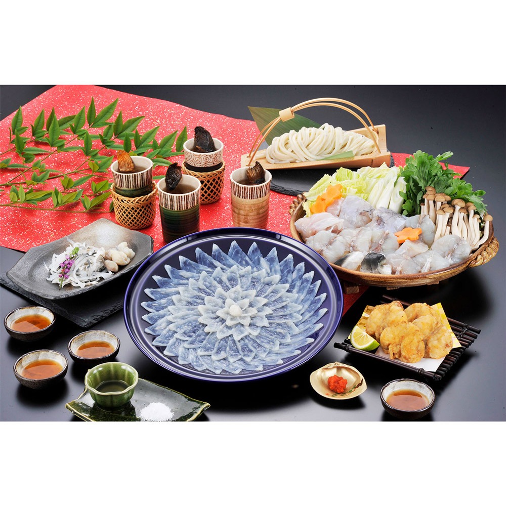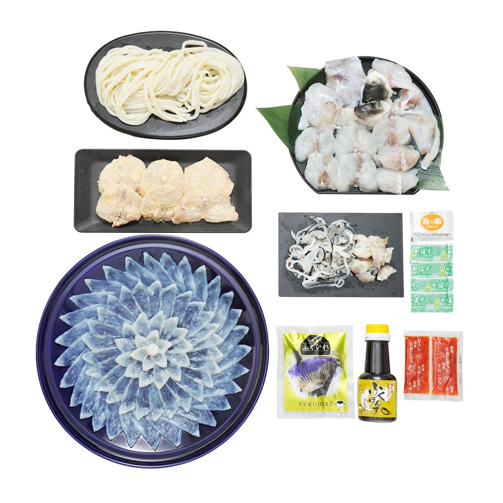 内容量:とらふく刺身115g(陶器皿30cm)、とらふく皮40g×2、ふくちり400g(アラ:トラフグ・身:マフグ各200g)、ごまふくから揚げ粉付き200g、とらふく入りうどん250g、ひれ酒用ヒレ5枚、ポン酢150ml、モミジオロシ16g×2、塩5g、カボス果汁2ml×4
