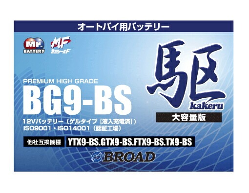 BG9-BS 二輪用バッテリー 駆 ブロード 6ヵ月補償 1万km補償 バッテリー 大容量 自己放電抑制 12V 互換性 即用式 バイクバッテリー オートバイ用バッテリー アメリカ純正 【代引/同梱不可】