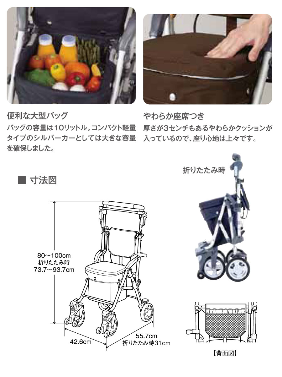 バッグの容量は10リットル、コンパクト軽量タイプのシルバーカーとしては大きな容量を確保しました