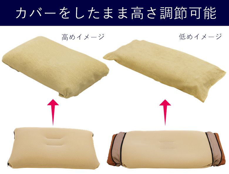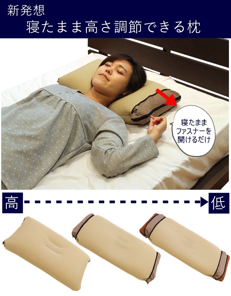 この枕は両サイドのファスナを開閉することにより簡易に高さが簡単に変えられて、
