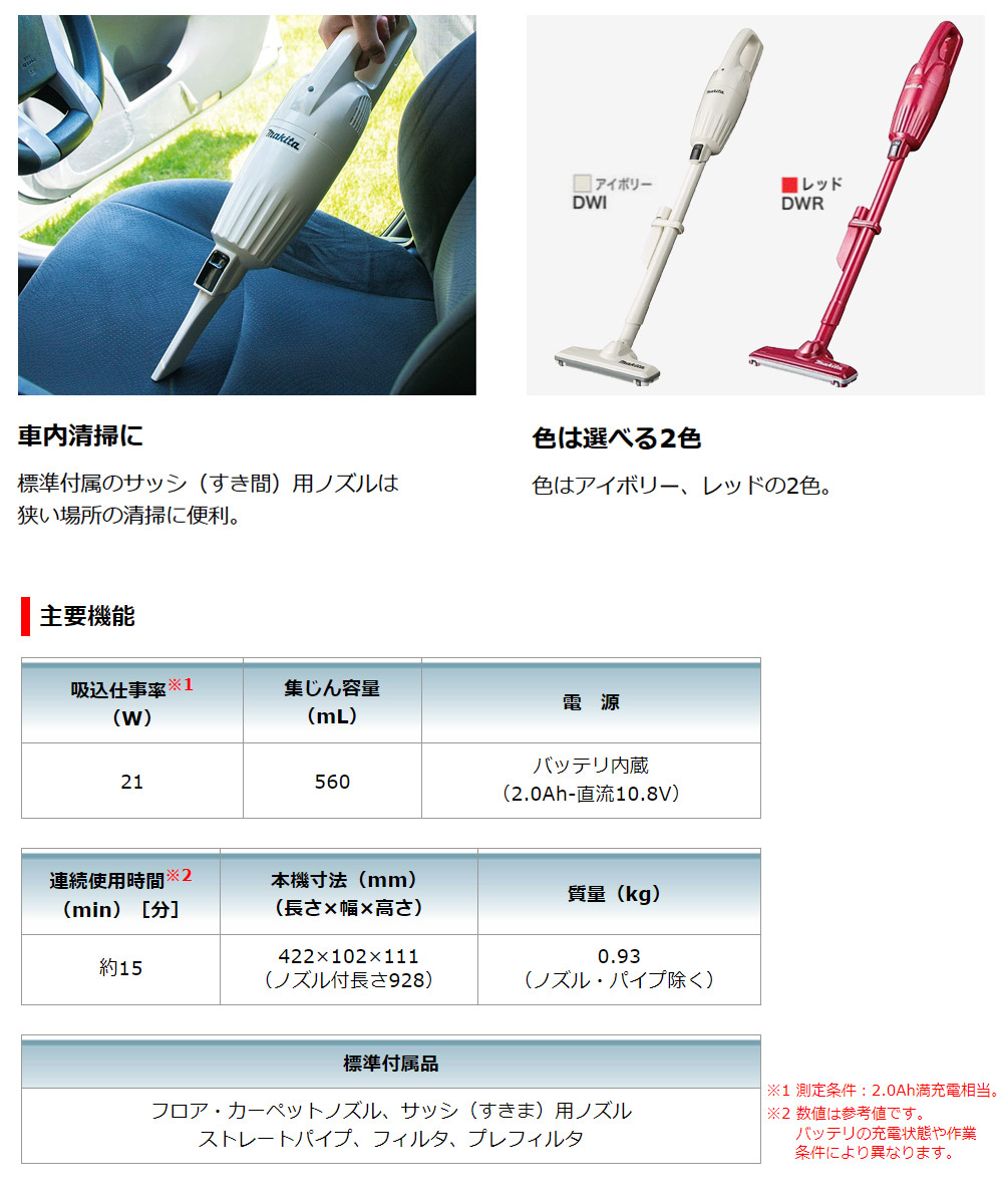 吸込仕事率は21W※。1充電使用時間は約15分。