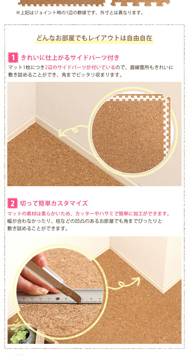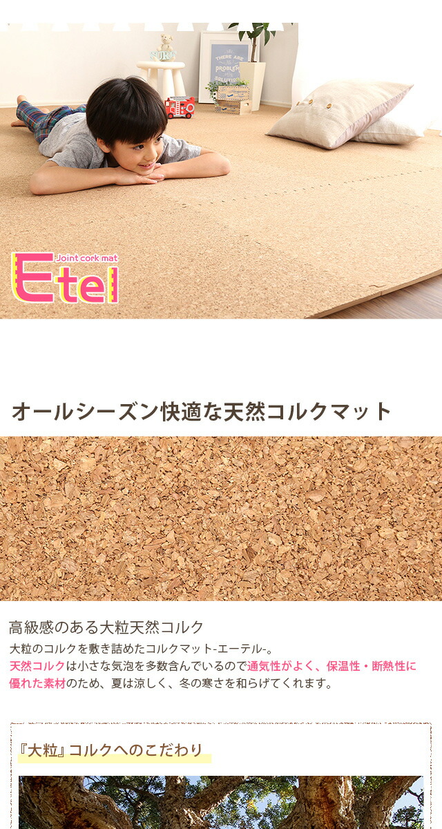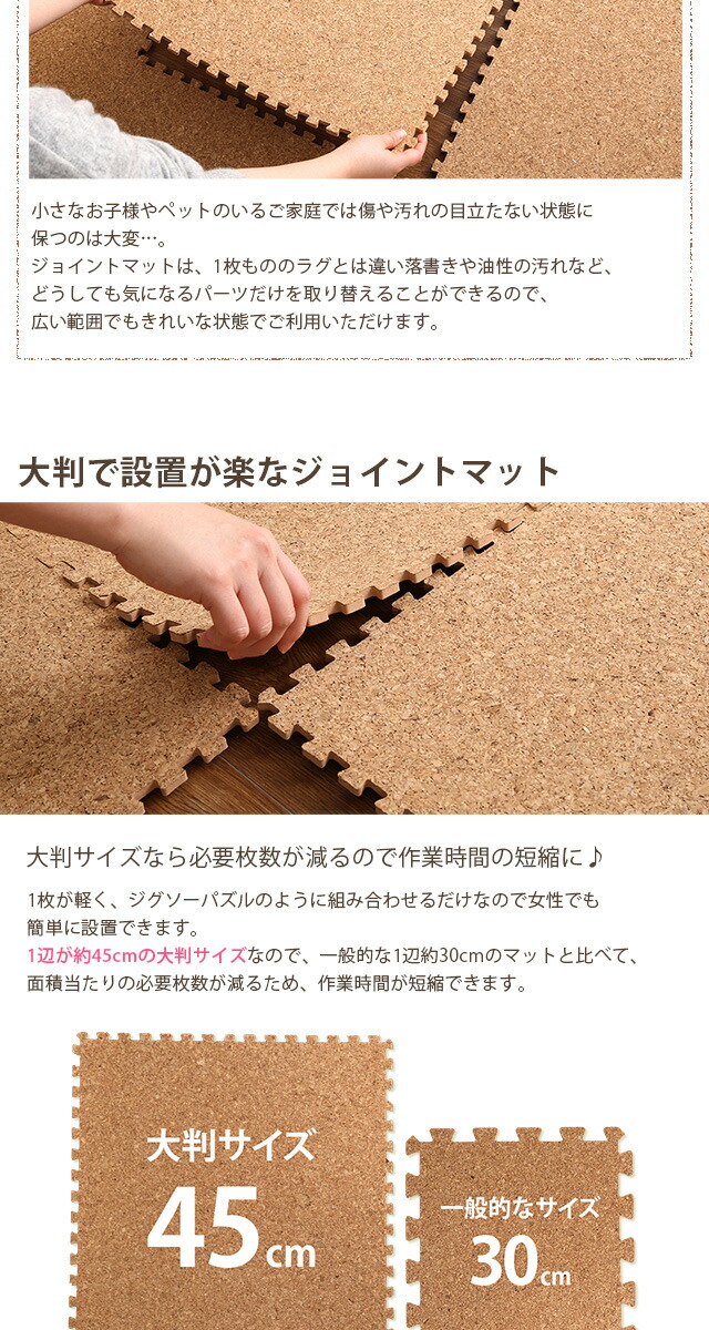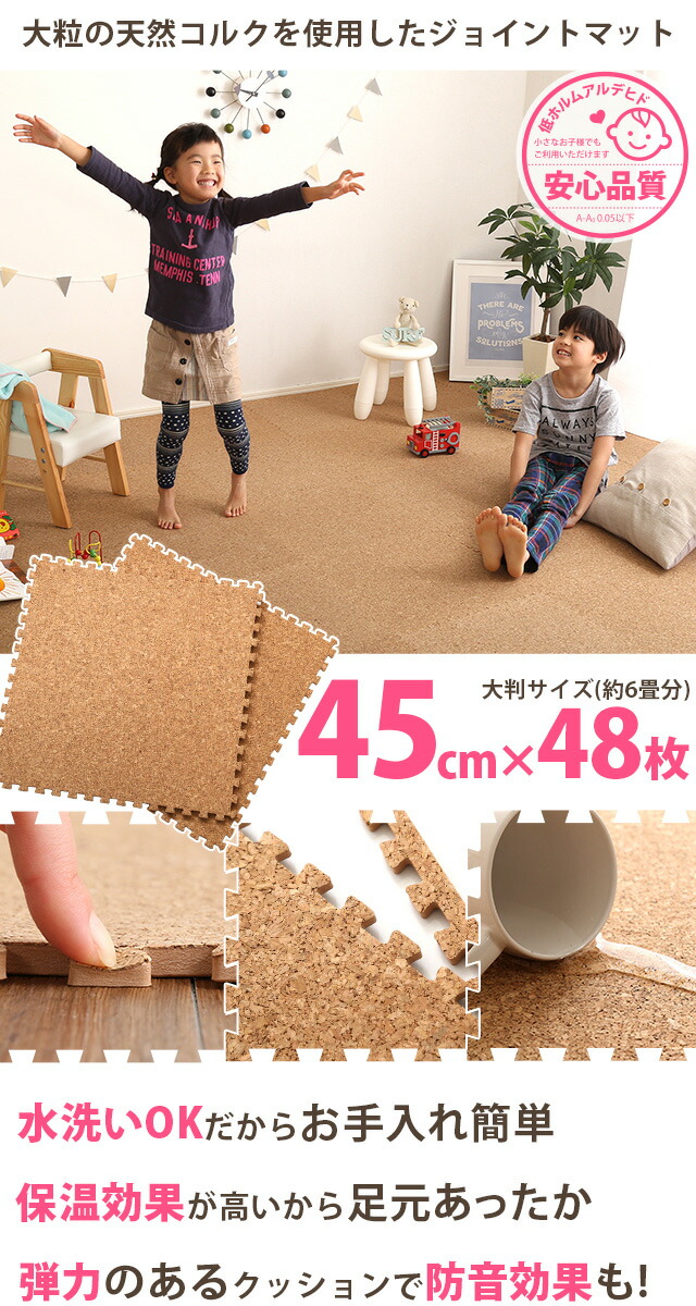サイドパーツ付き!ジョイントコルクマット 48枚セット(大判45cm)安心の低ホルムアルデヒド、防音、保温 Etle-エーテル-代引不可[ナチュラル]