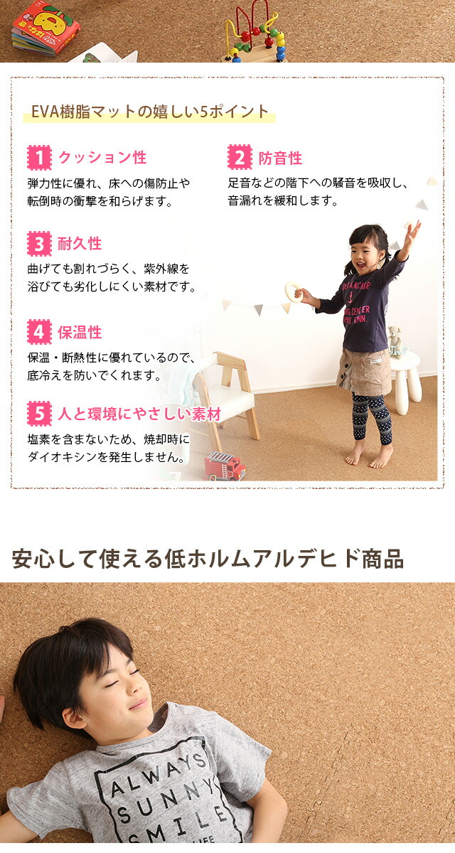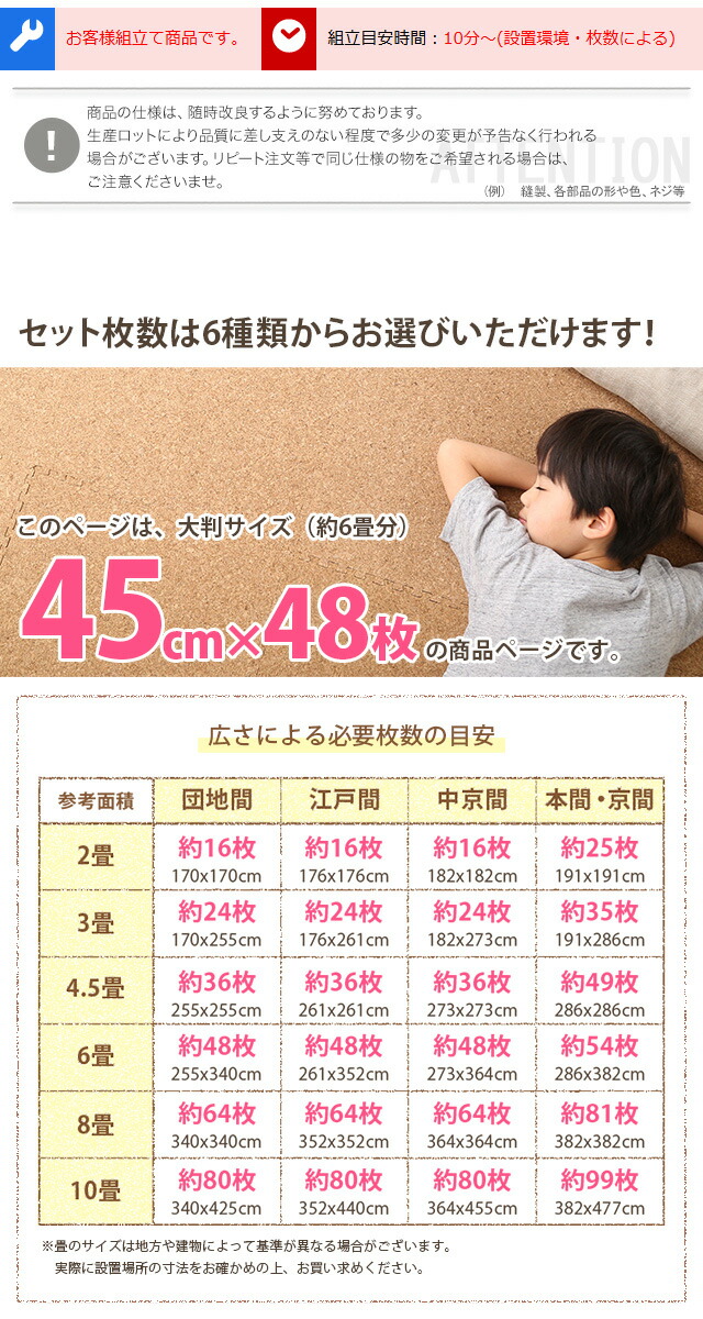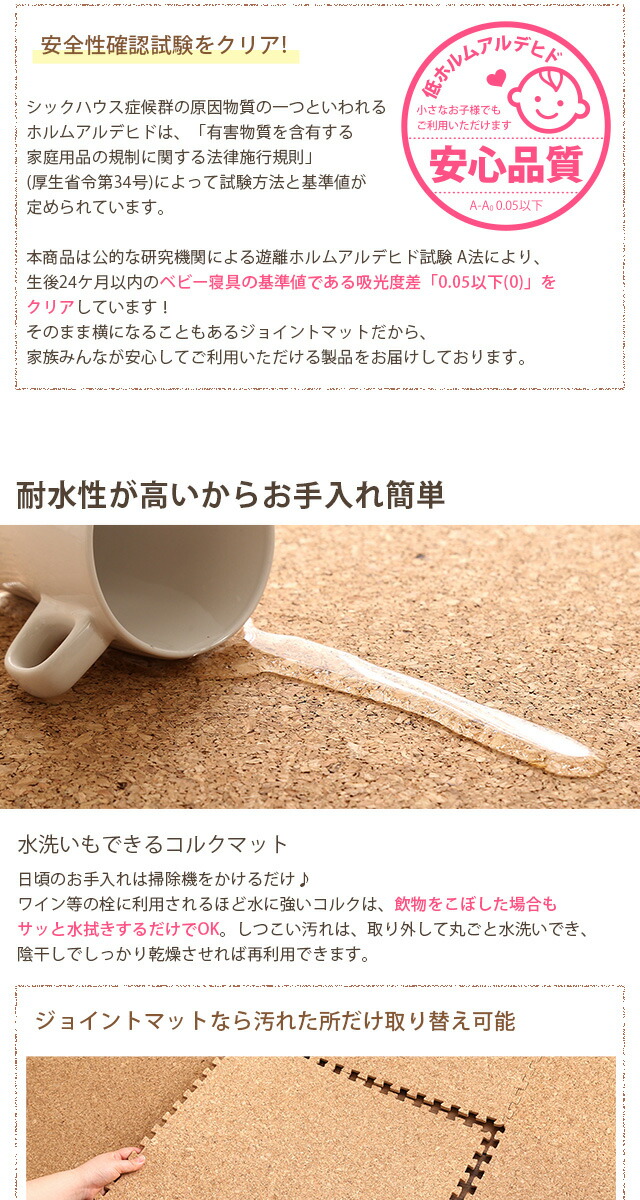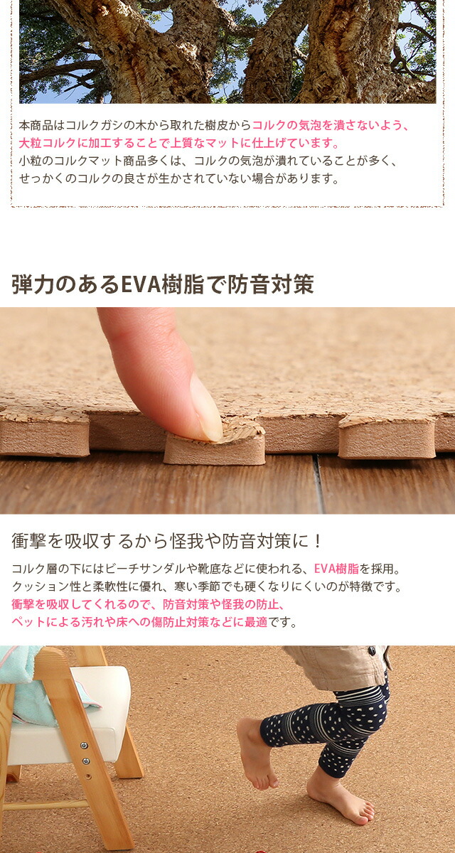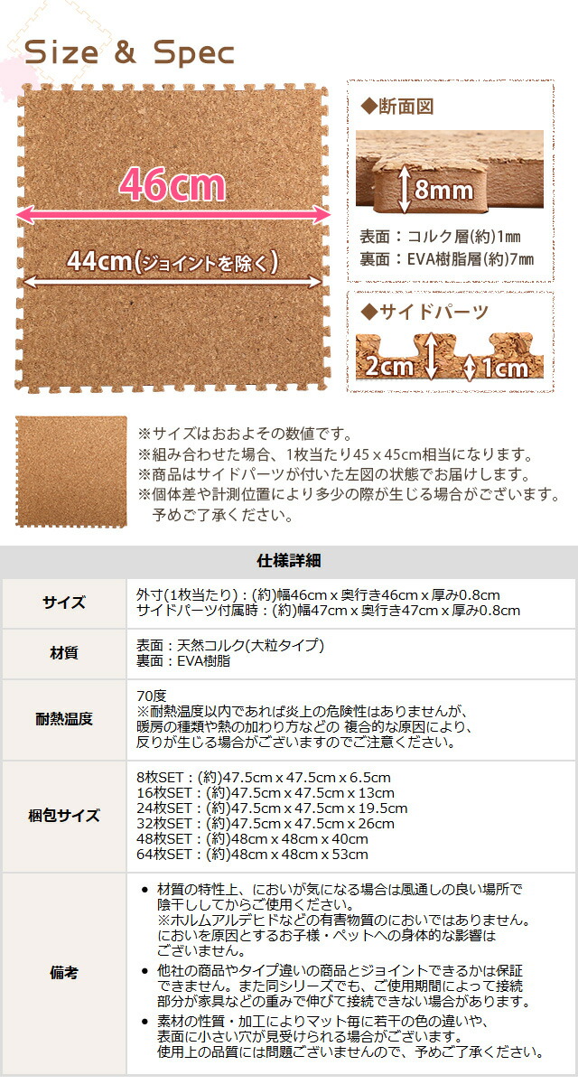 サイドパーツ付き!ジョイントコルクマット 48枚セット(大判45cm)安心の低ホルムアルデヒド、防音、保温 Etle-エーテル-代引不可[ナチュラル]