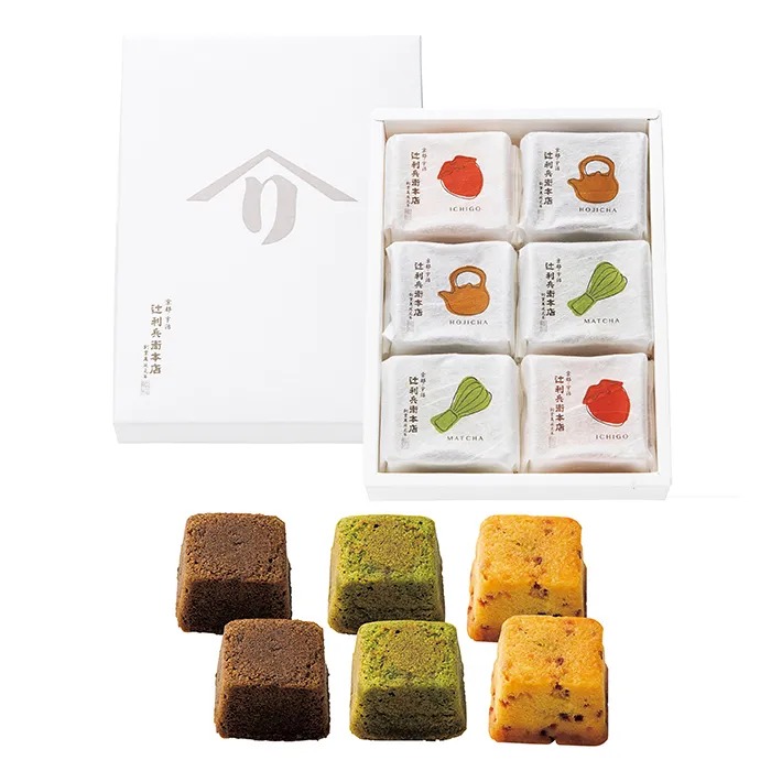 辻利兵衛本店 賽の茶 6個 個包装 キューブケーキ プチケーキ 和 抹茶 ほうじ茶 玄米茶 いちご 苺 抹茶クリーム キューブ型 しっとり お菓子 焼き菓子 詰め合わせ ギフト プレゼント 93021-03 【代引不可】