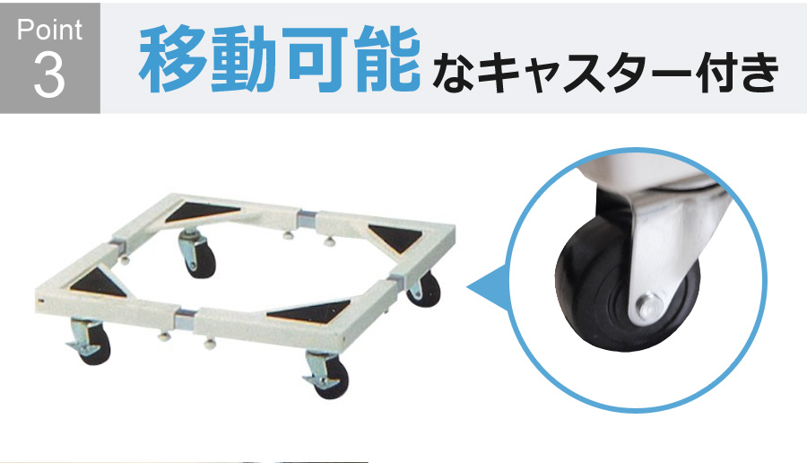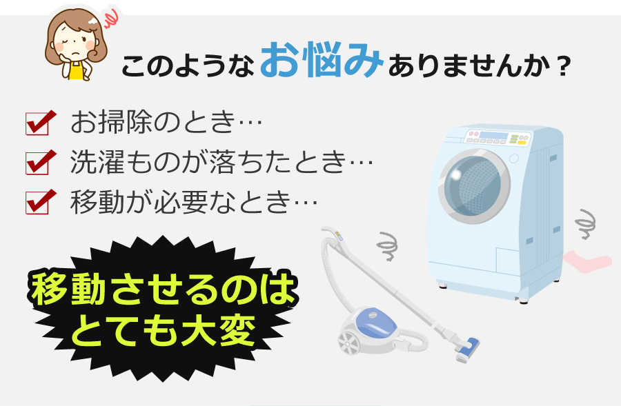お掃除のとき、洗濯物が落ちたとき、移動が必要なとき、洗濯機が動かせなくて困ることがなくなります!キャスターのストッパーを外せば移動もラクラク。