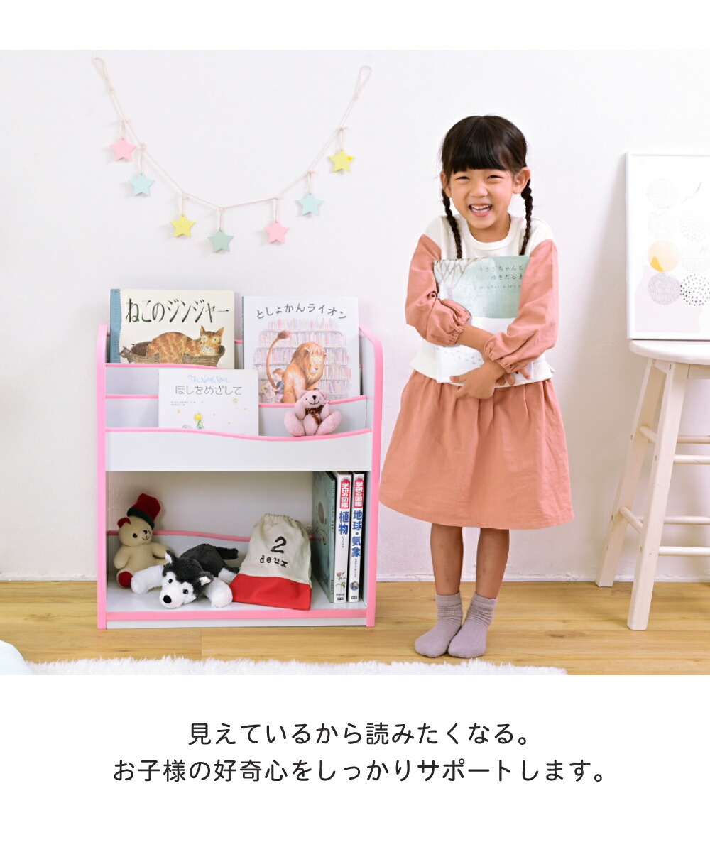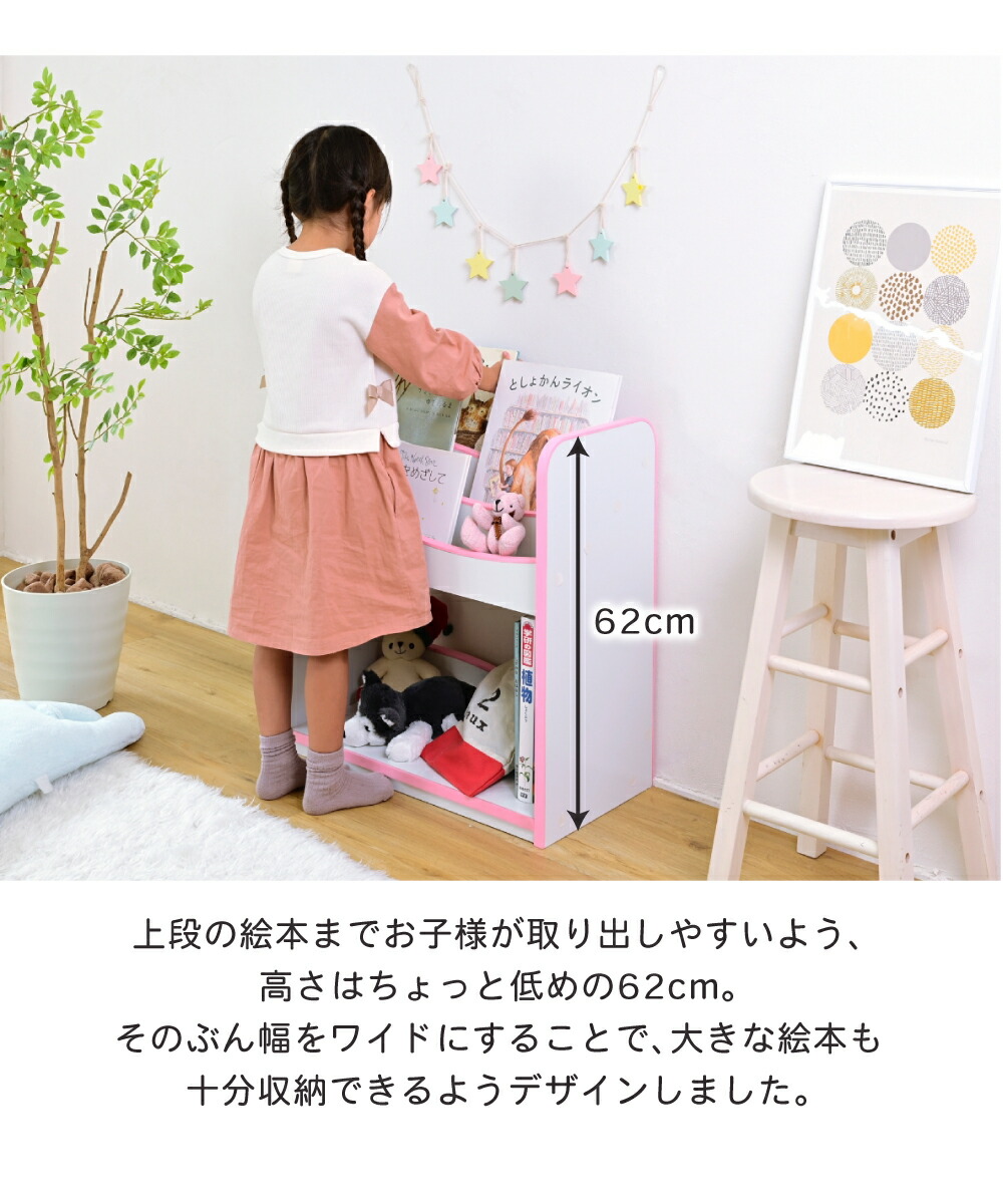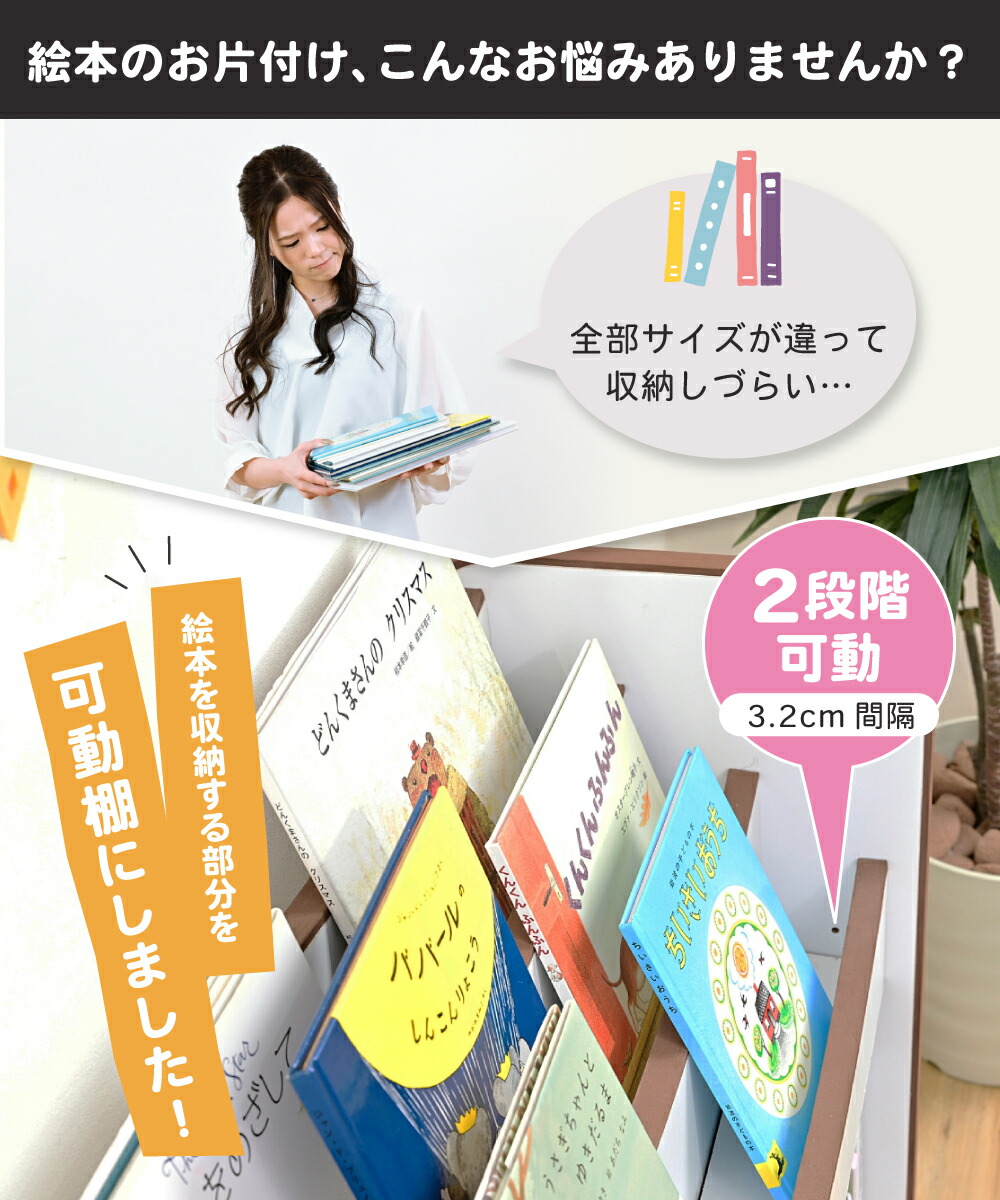 弾力性、衝撃吸収に優れたEVA樹脂をすべてのフチに採用。さらに角を丸くして金具の使用を極力減らした、小さなお子様も安全にご使用いただけるシリーズです。お子様の目線に合わせた絵本ラックは、表紙が見えるので自分で読みたい絵本を選べます。サイズがバラバラの絵本も綺麗に収納できる可動棚を採用。