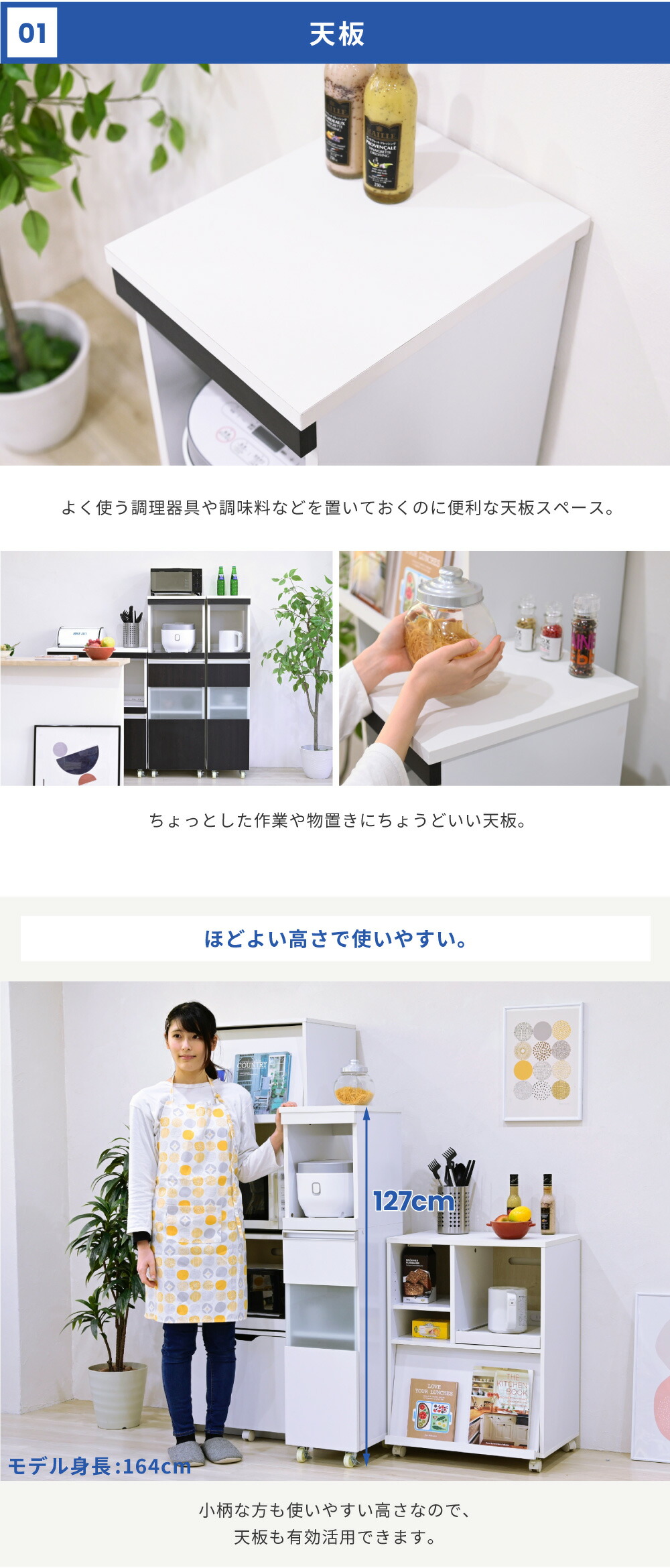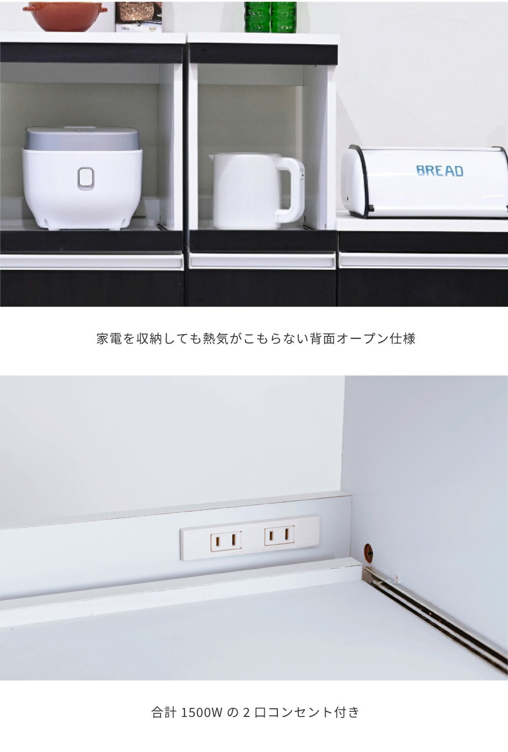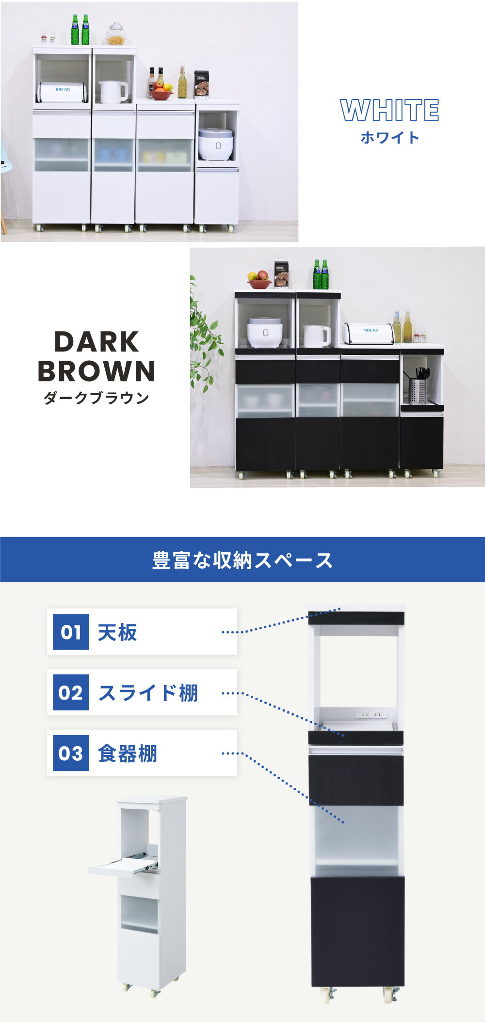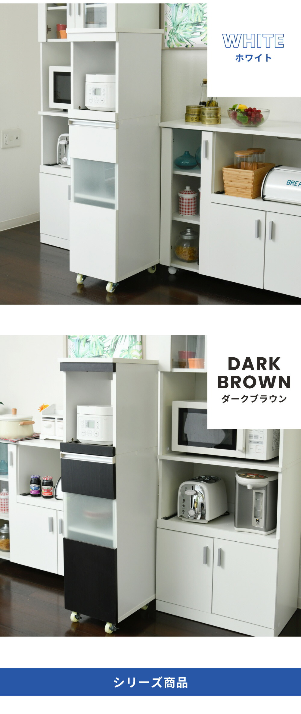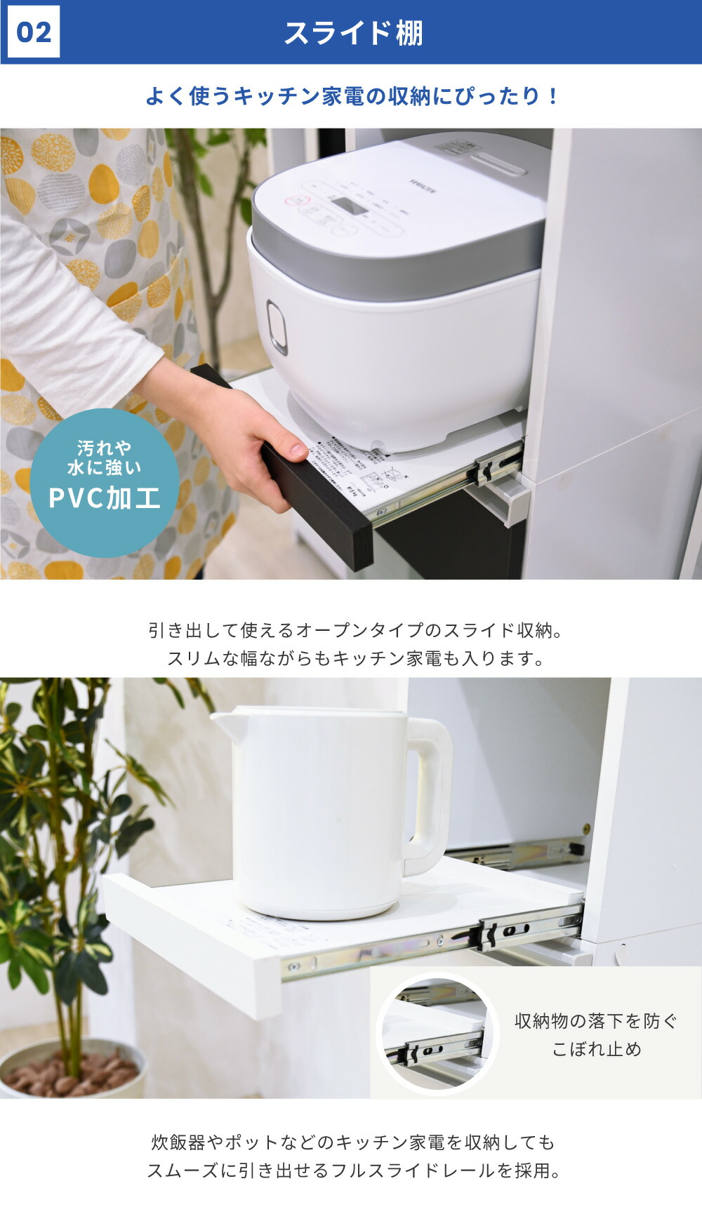家電の収納に便利なコンセント付きスライド棚と、収納物に合わせて高さ調節ができる可動棚付きのラックをこれ1台で。ハイタイプは収納量も抜群。キッチンのちょっとした隙間に設置すれば、それまでのデッドスペースを有効活用できます。