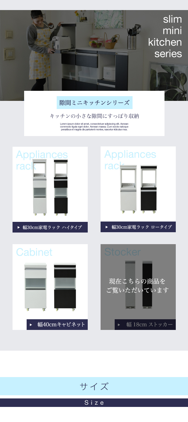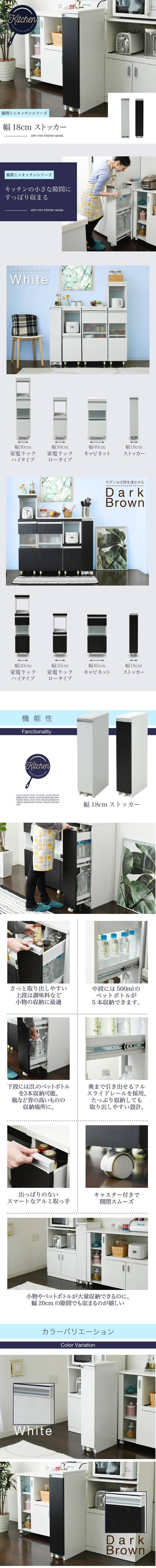 ちょっとした隙間にもスポッと入る幅18cmのストッカー。スリムな見た目ながらも中段には500mlのペットボトルが5本、下段には2Lのペットボトルが3本入る収納量。上段には小さな調味料などの収納にぴったり。たっぷり収納してもキャスター付きの引き出しで出し入れ楽々。