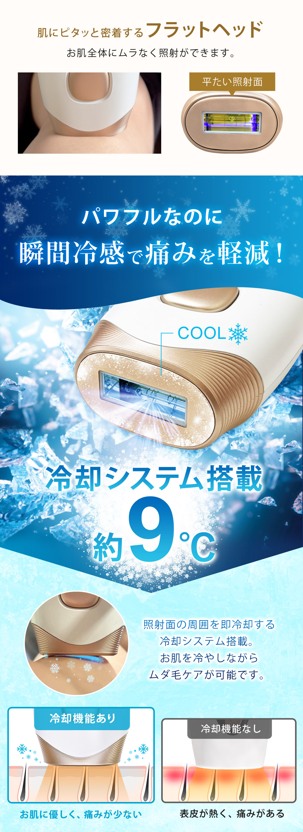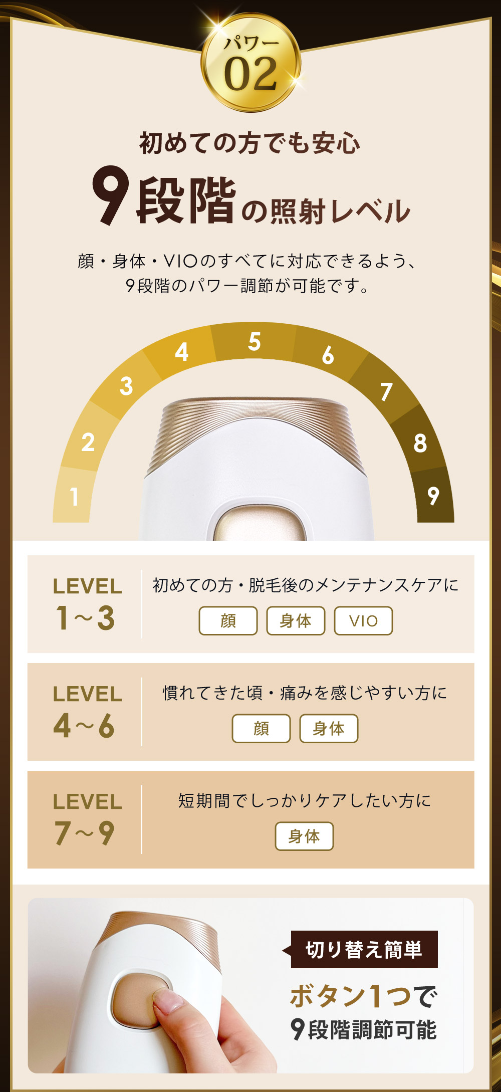 顔・身体・VIOのすべてに対応できるよう、9段階のパワー調節が可能です。