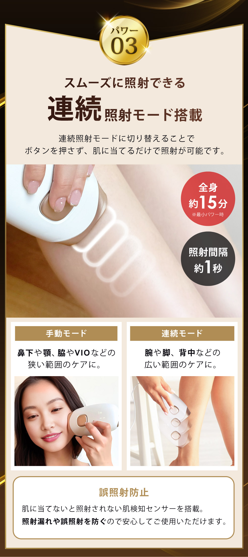 連続照射モードに切り替えることでボタンを押さず、肌に当てるだけで照射が可能です。