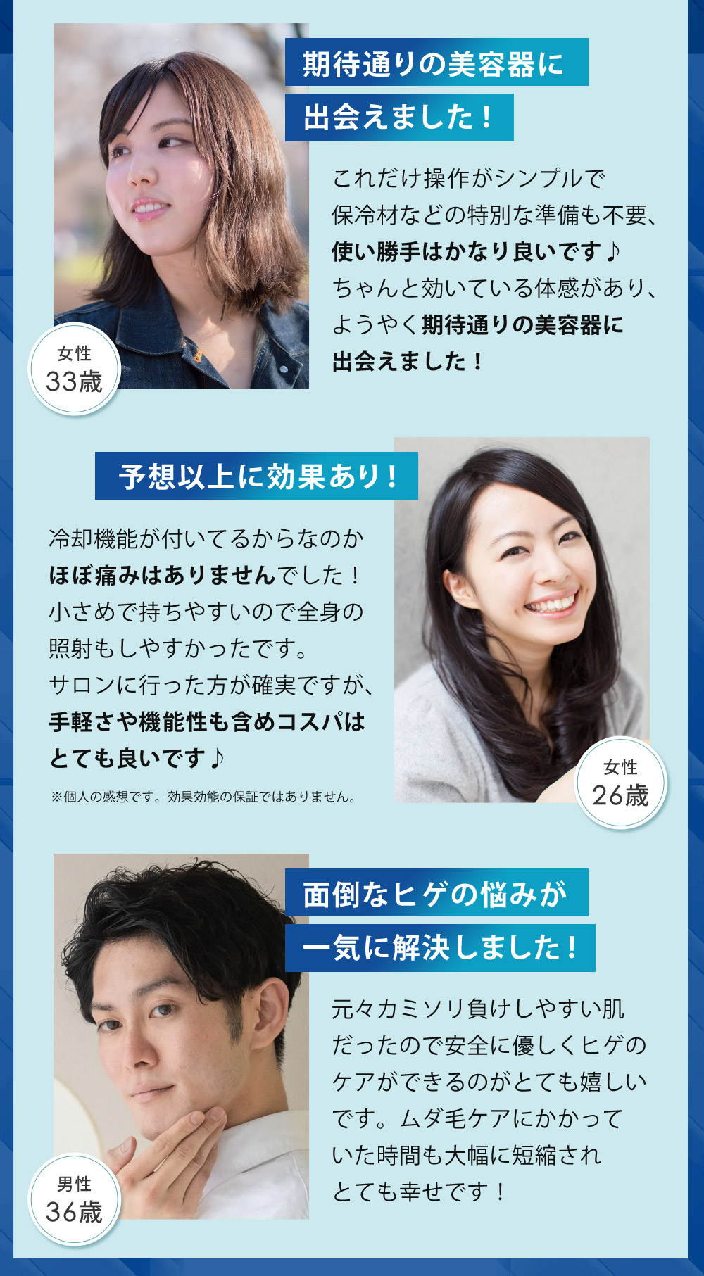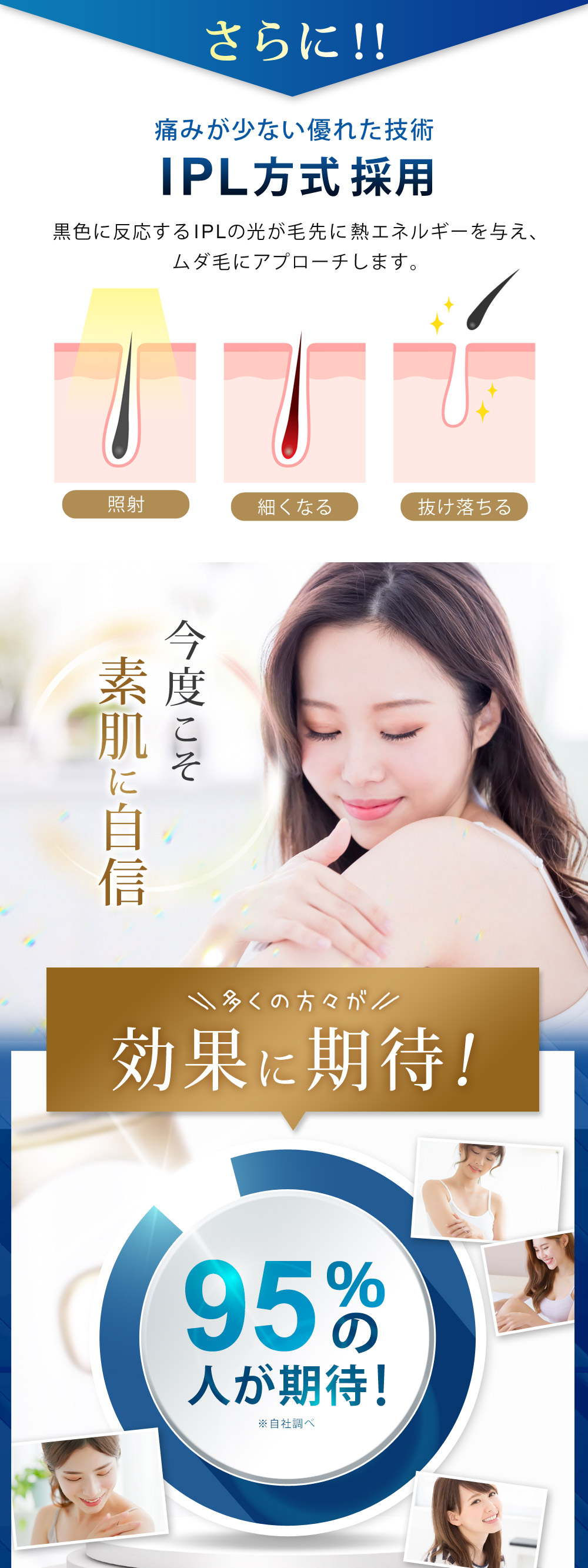 ジュール数が高すぎると火傷や赤みなどの肌トラブルの原因に、低すぎると効果がないという矛盾を解決すべく、ムダ毛処理に最も効果的なパワーです。