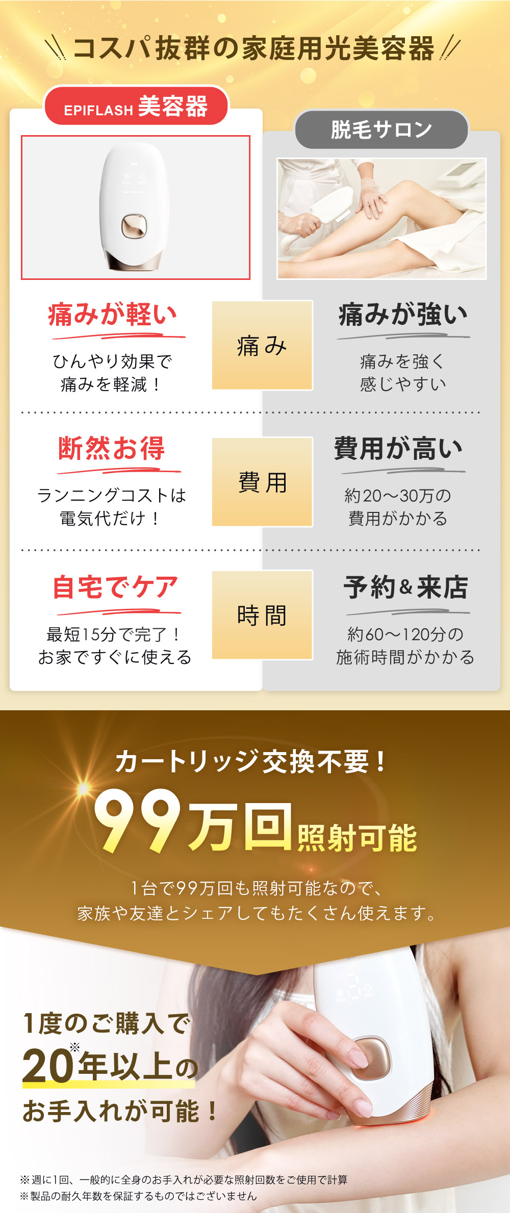 検索キーワード: エピフラッシュ 99万回照射 9段階調節 顔 ヒゲ 髭 ワキ 脇 うぶ毛 腕 指 足 脚 VIO アンダーヘア ビキニライン 男女兼用 全身ケア サロン級 冷感 脱毛器 フラッシュ式 IPL脱毛器 光脱毛器 フラッシュ式脱毛器 家庭用脱毛器 冷感脱毛器 脱毛 自宅脱毛 女性 男性 脱毛機 ムダ毛