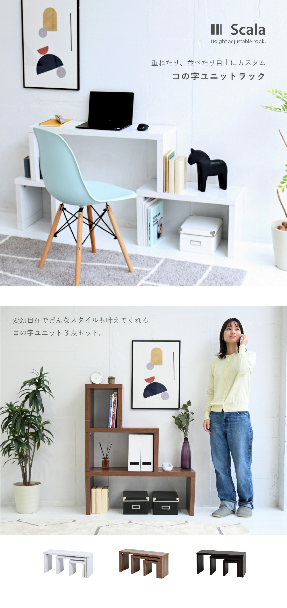 高さ調整の継ぎ脚を組み替えることで、ネストテーブルにも広々したリビングテーブルにも階段シェルフにもなる便利な優れもの”Scala”。使い方次第でお部屋の印象を変化させてくれるシェルフです。