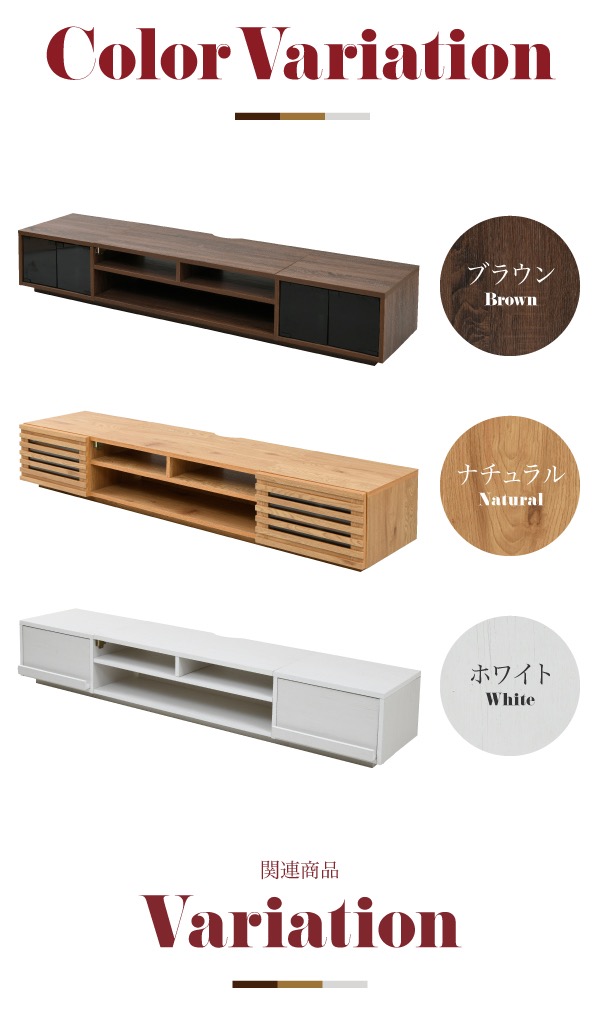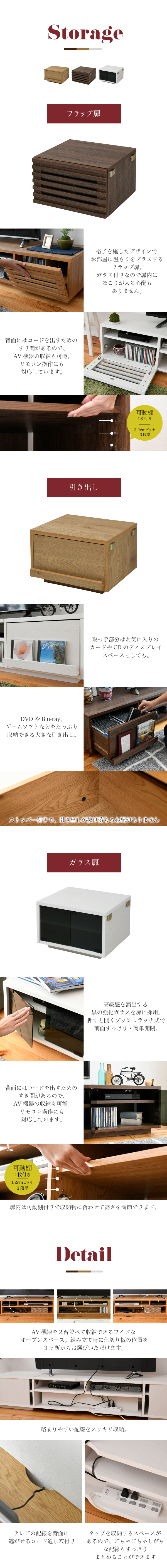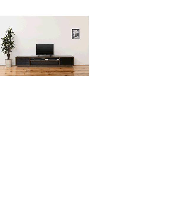 左右の収納は引き出し、フラップ扉、ガラス扉の3種類からお好きな組み合わせを選んでいただけます。大型テレビを置いても雑貨をディスプレイしても使える幅180cmのワイドデザイン。お部屋の圧迫感を軽減するロータイプ設計です。