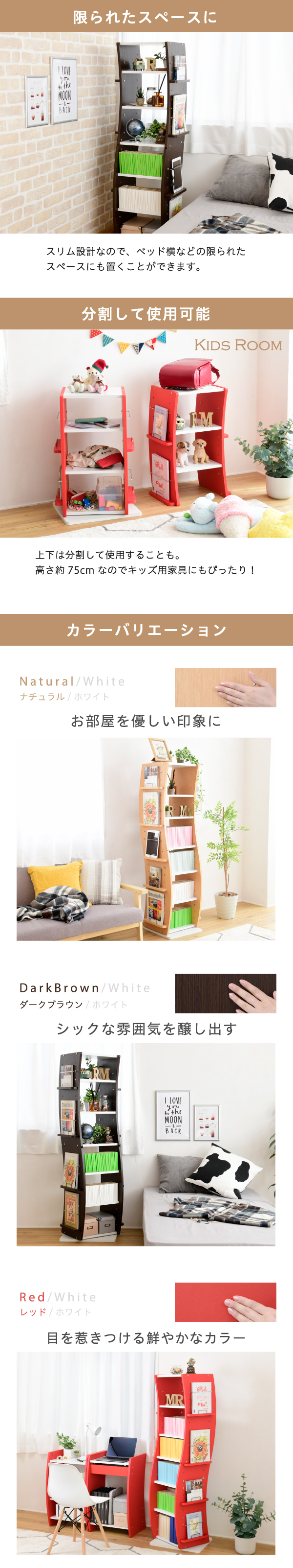 360度自由に回転するラックはどの方向からでも本や小物を取り出せるのが便利。天板も含めて全ての棚が可動式だから、収納物にあわせて細かく微調整が可能です。また、分割して横に並べることでロータイプのラックとして使用してもOK。お部屋の空間や好みに合わせて自由にレイアウトできます。自由な機能と、特徴的なウェービーな側板デザインが上手く融合し、機能性とデザイン性を高次元で両立しました。