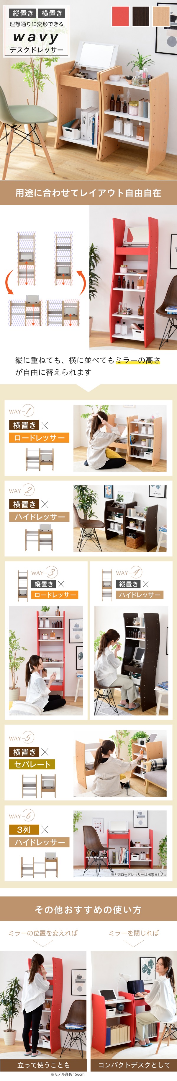鏡台 ロードレッサー ハイドレッサー 細長い ミラー 机 兼用化粧 メイク 化粧品 多機能 スタッキング 積み重ね 高さ調整 組み合わせ 組み換え 木目 木製 白 ダークブラウン 茶色 レッド