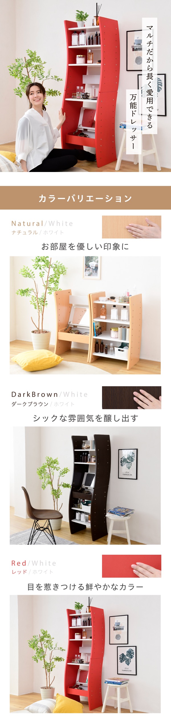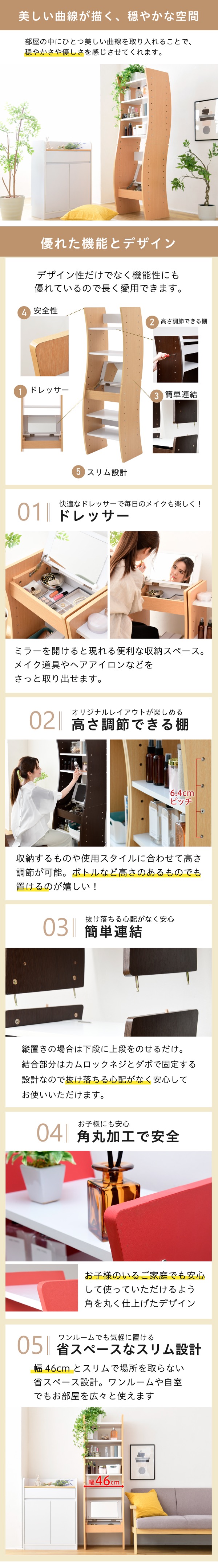 好みに合わせて、イス仕様のハイタイプ、座仕様のロータイプに設定可能。天板も含めて全ての棚が可動式だから、さらに細かく微調整可能。また、縦に積み重ねても、横に並べてもOKなので、お部屋の空間や好みに合わせて自由にレイアウトできます。可動式の棚だから、収納物に合わせて調整できるので、散らかりがちなメイク道具もこの商品一つですっきり収納できます。自由な機能と、特徴的なウェービーな側板デザインが上手く融合し、機能性とデザイン性を高次元で両立しました。