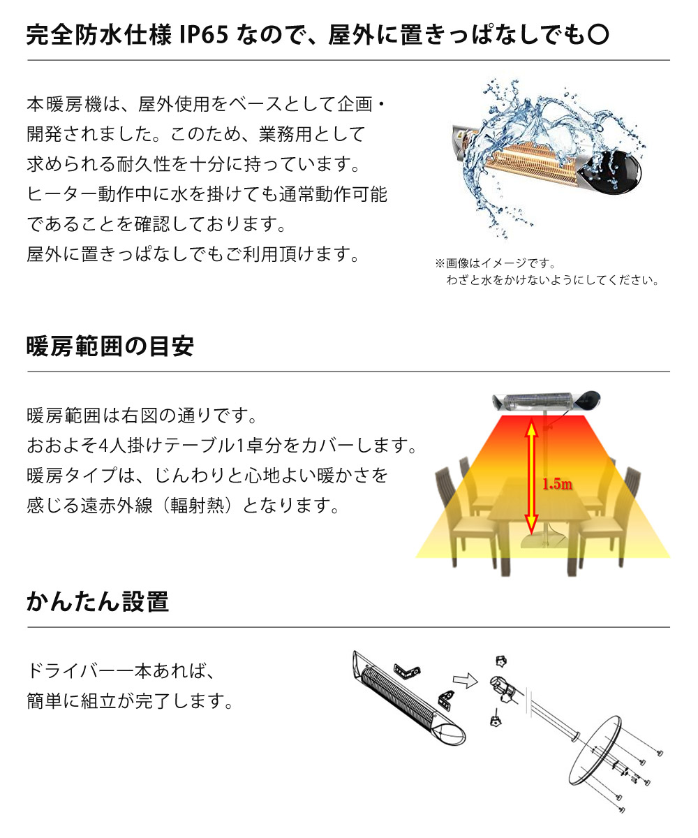 本暖房機は、屋外使用をベースとして企画・開発されました。このため、業務用として求められる耐久性を十分に持っています。ヒーター動作中に水を掛けても通常動作可能であることを確認しております。屋外に置きっぱなしでもご利用頂けます。