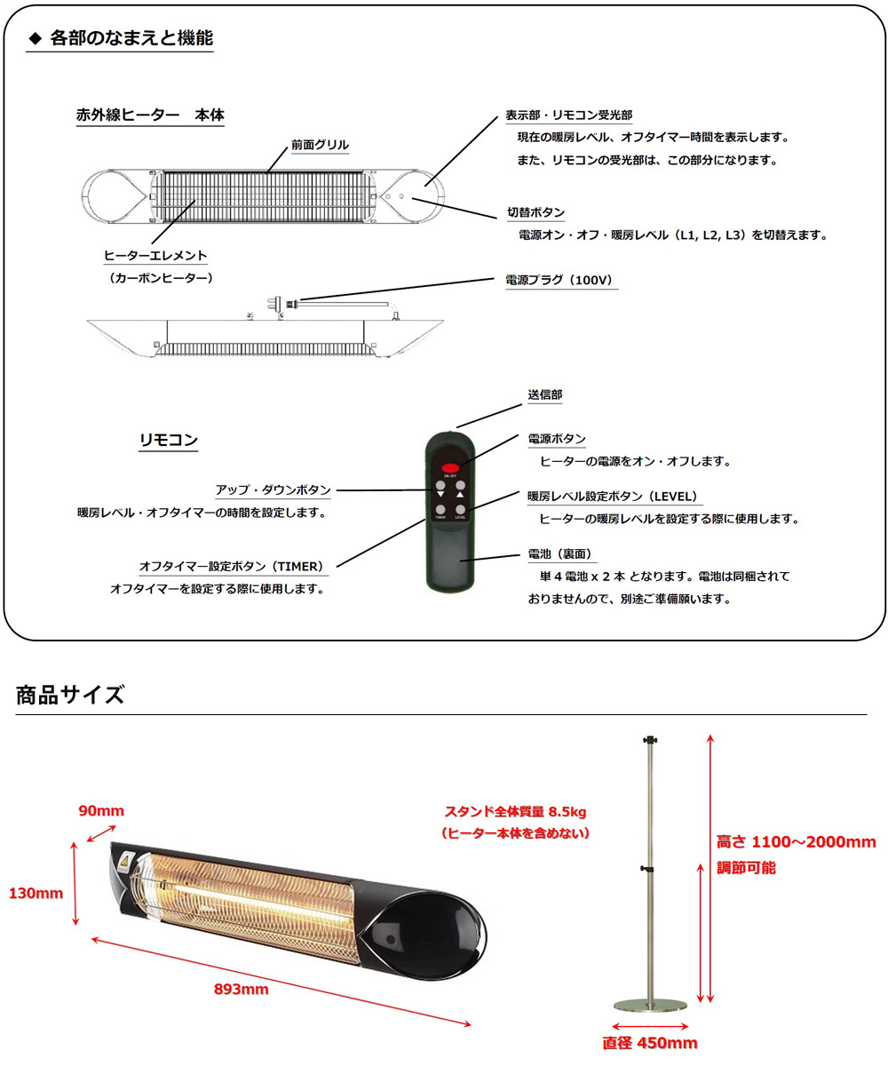 検索キーワード: ヒーター スタンドタイプ 屋外 屋内 カーボンヒーター 赤外線ヒーター 電気ヒーター スタンドヒーター 防水 防水ヒーター 業務用 屋外暖房 屋外暖房機 屋外用 室内用 電気ストーブ 暖房器具 電気暖房機 リモコン操作 飲食店 店舗 カフェ レストラン ホテル テーマパーク イベ