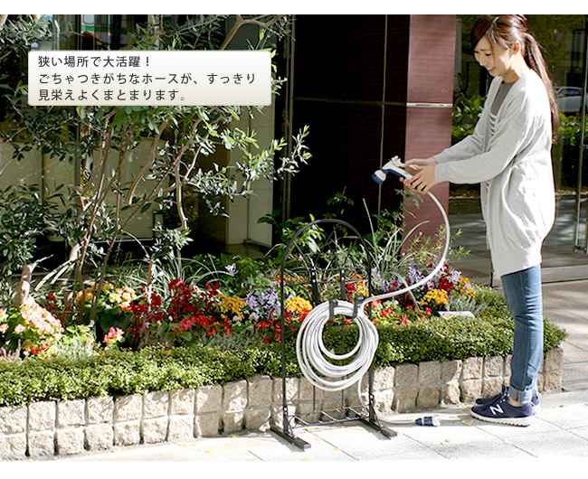 置き場所に困るホースを、簡単にすっきり収納できるホースハンガーです。