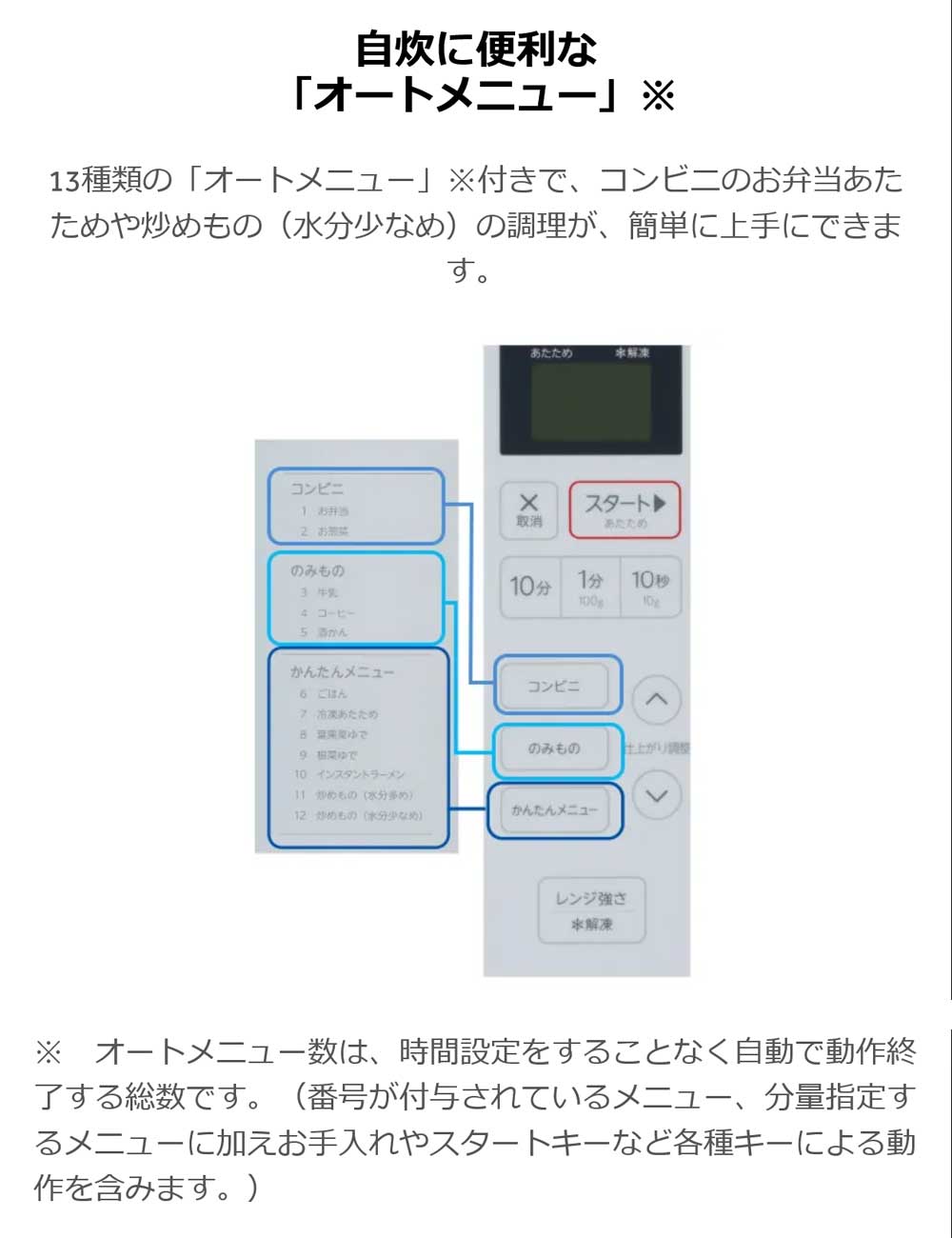13種類の「オートメニュー」※付きで、コンビニのお弁当あたためや炒めもの(水分少なめ)の調理が、簡単に上手にできます。
