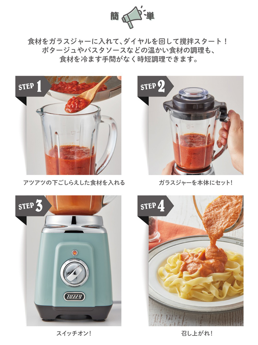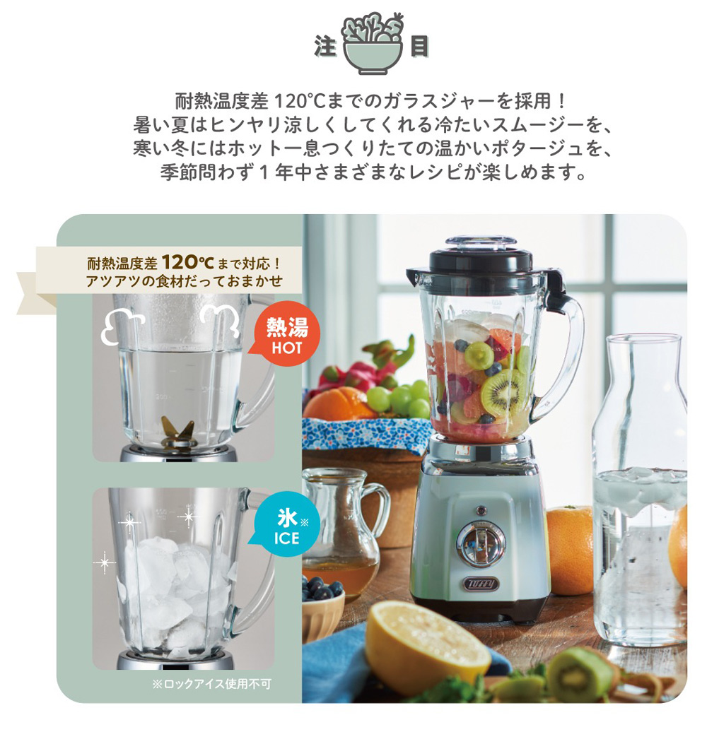 検索キーワード: ブレンダー ガラスブレンダー フードブレンダー フードミル ミキサー ジューサー ジュースカッター プロセッサー トフィー TOFFY TOFY ラドンナ 耐熱 温度差 アイス 氷 スムージー スピード調整 耐熱ガラス 熱湯 ポタージュ スープ 離乳食 介護食 混ぜる なめらか スリム コ