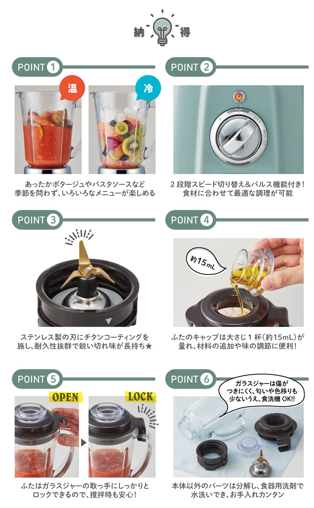冷たいスムージーやジュースはもちろん、アツアツの食材も撹拌できるので、