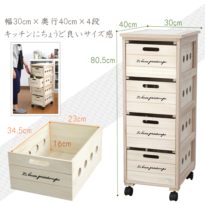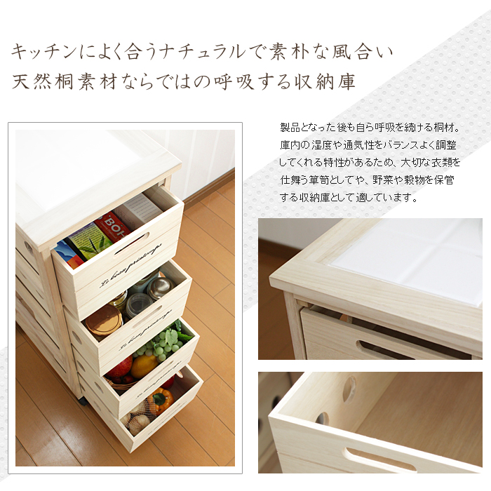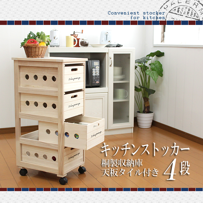 キッチン便利ストッカー 4段 木製 ワゴン キャスター付き キッチンワゴン キッチンストッカー キッチン収納 食品収納 棚 引き出し 天然桐 キッチン 収納 おしゃれ ストッカー 野菜ストッカー キッチンラック ラック サイドチェスト シンプル KC-34 【代引不可】