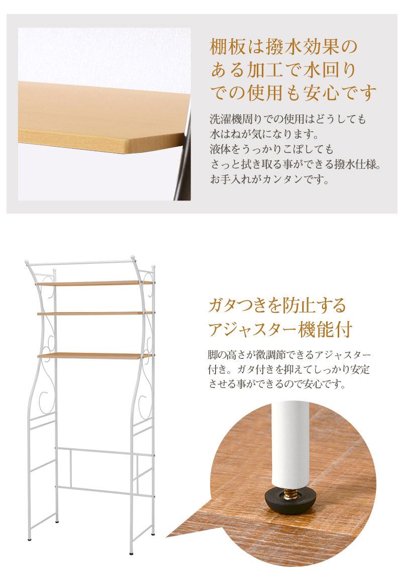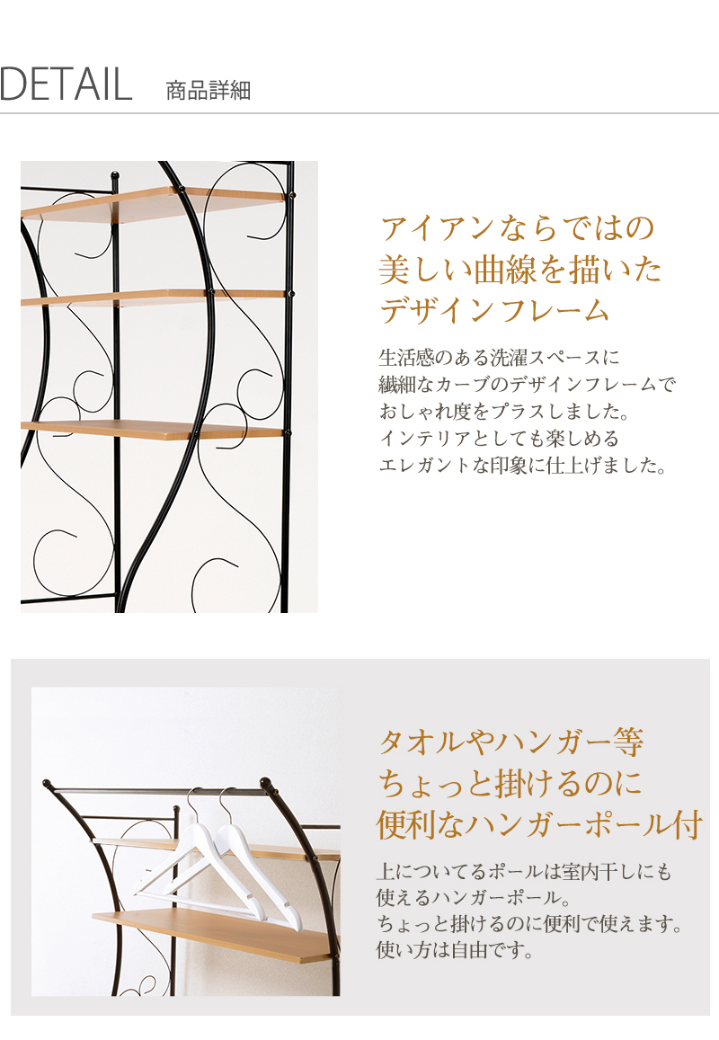 検索キーワード:インテリア 家具 ランドリースペース ランドリー エレガント ラック 曲線 棚 3段 引っ掛け 小物 洗剤 洗濯用品 タオル掛け ハンガー掛け 撥水