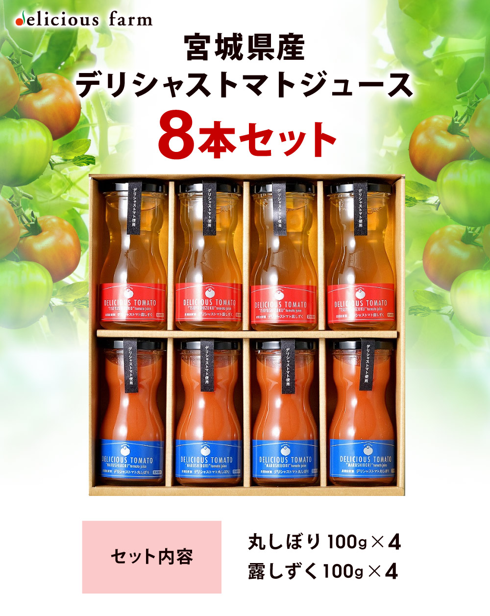 トマトジュース 100g 紅白8本セット デリシャストマト 詰め合わせ デリシャスファーム 宮城県産 トマト ジュース 無塩 無添加 ギフト プレゼント お歳暮 お中元 誕生日 贈答 お祝い 内祝い 結婚祝い 引き出物 出産祝い 快気祝い KH-8