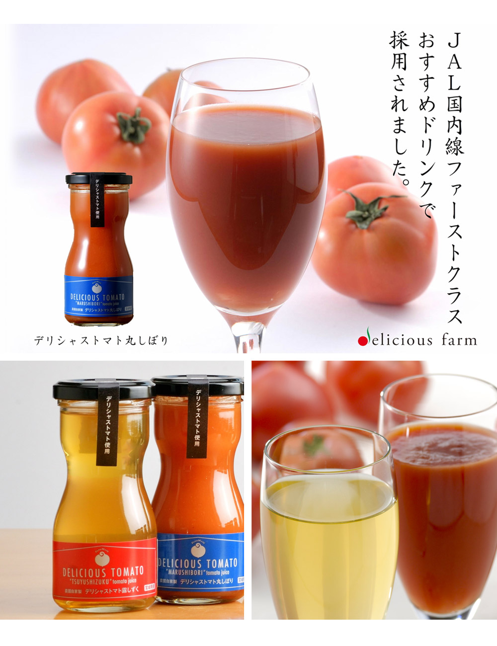 フルーツのように甘く酸味とのバランスの良い「デリシャストマト」をそのまま絞った濃厚な「丸しぼり」と、「露しずく」は時間をかけて丁寧に漉し旨味だけを抽出したトマトなのに透き通る黄金色のジュース。
