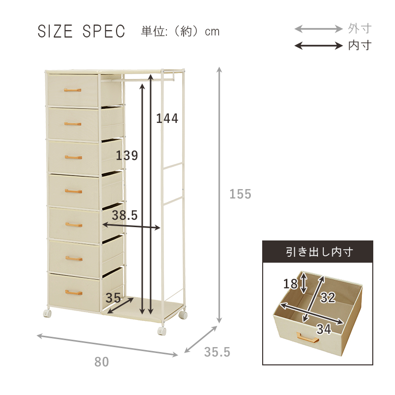 商品サイズ(外寸):(約)幅80×奥行35.5×高さ155cm