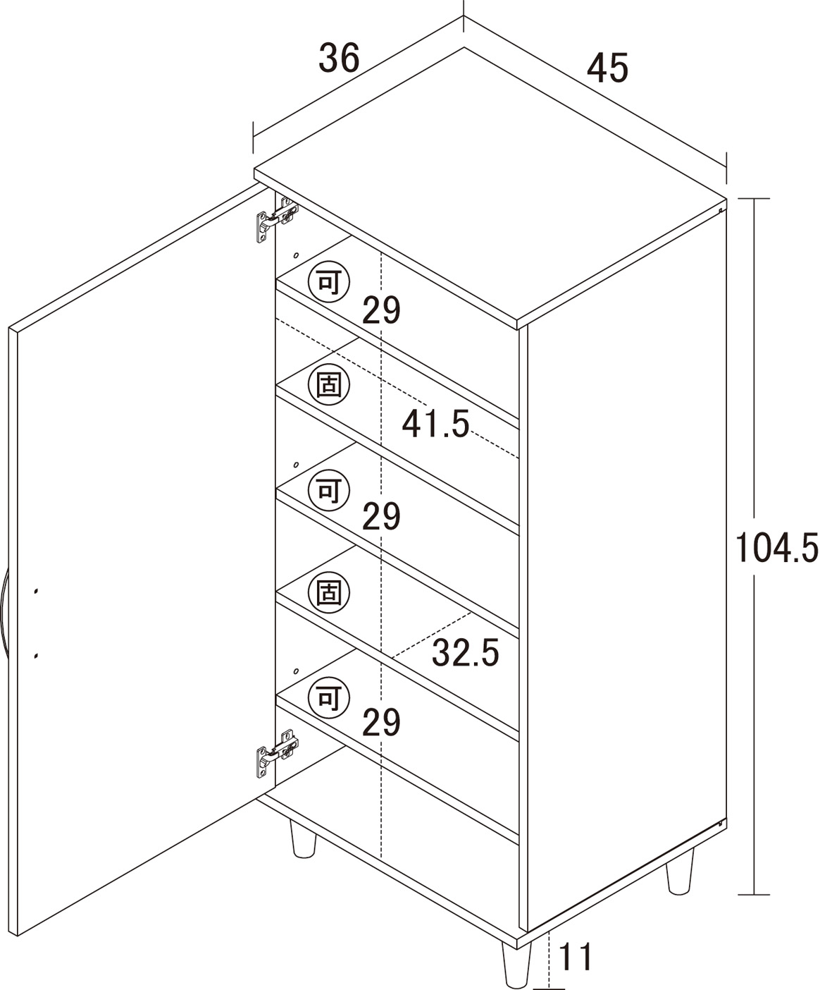 ○固定棚2ヶ所、可動棚3枚、靴の高さに合わせて位置を変えられます。
