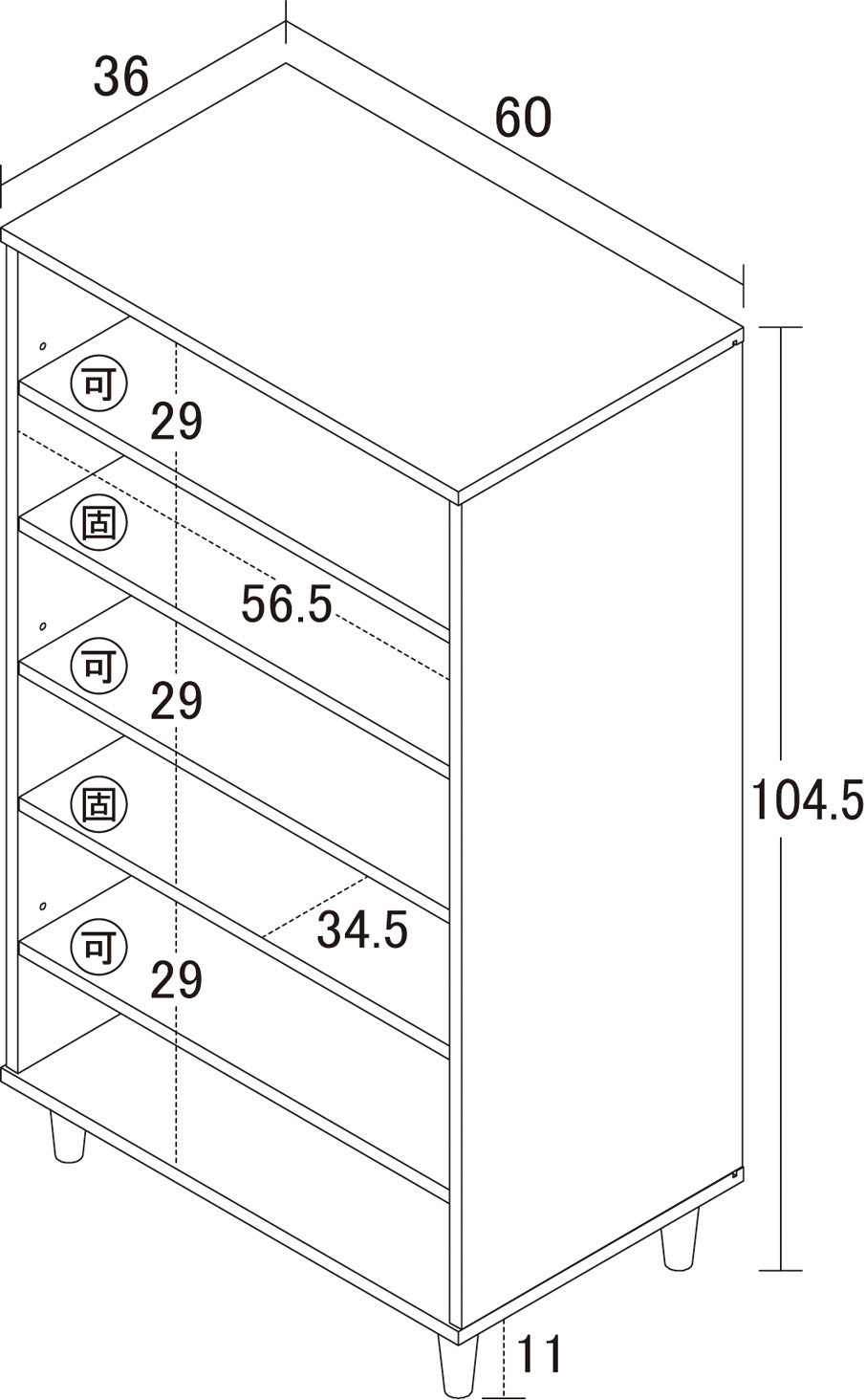 ○固定棚2ヶ所、可動棚3枚、靴の高さに合わせて位置を変えられます。