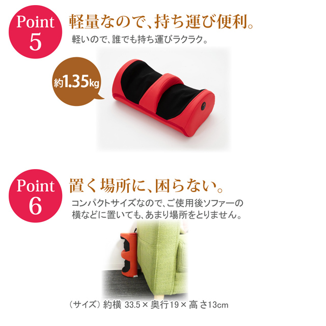 疲れた足を手もみ感覚でリフレッシュでき、軽量なので持ち運びもラクラクです。