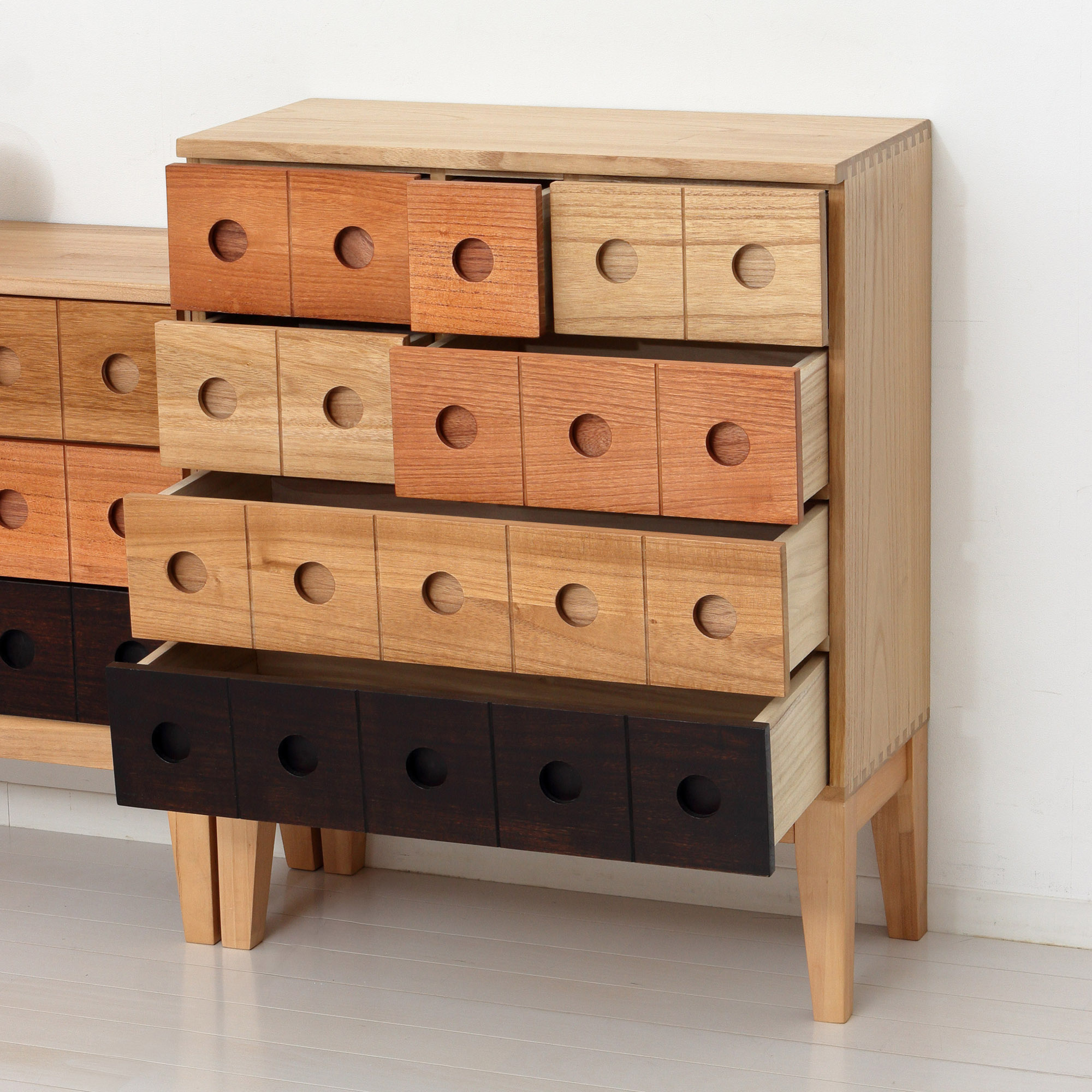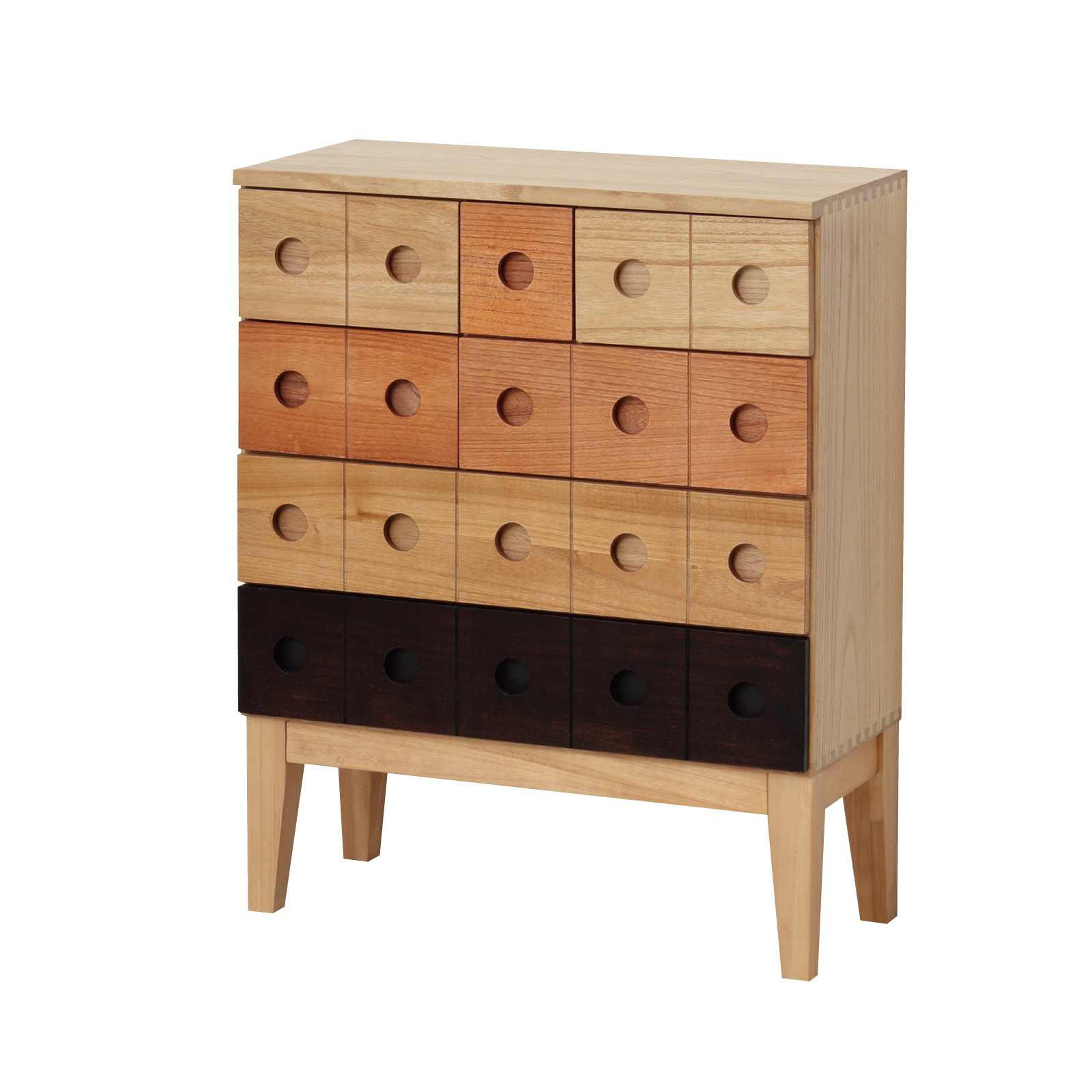 ○遊び心があるデザインと素朴で自然な色合いを組み合わせたチェストです。