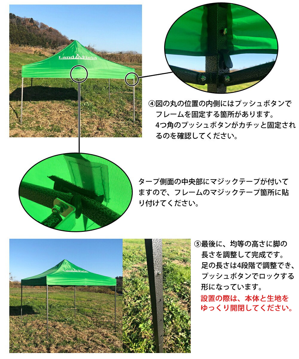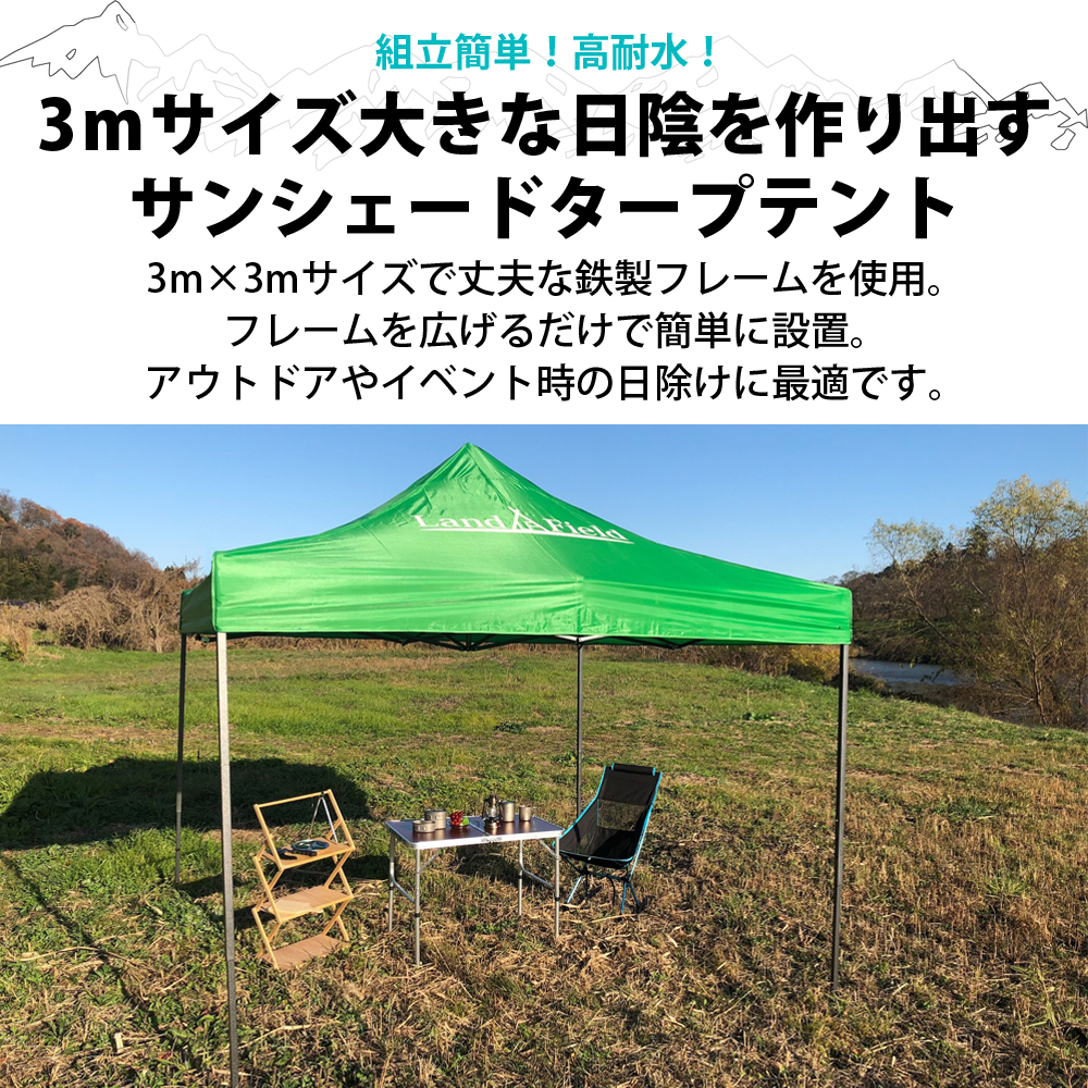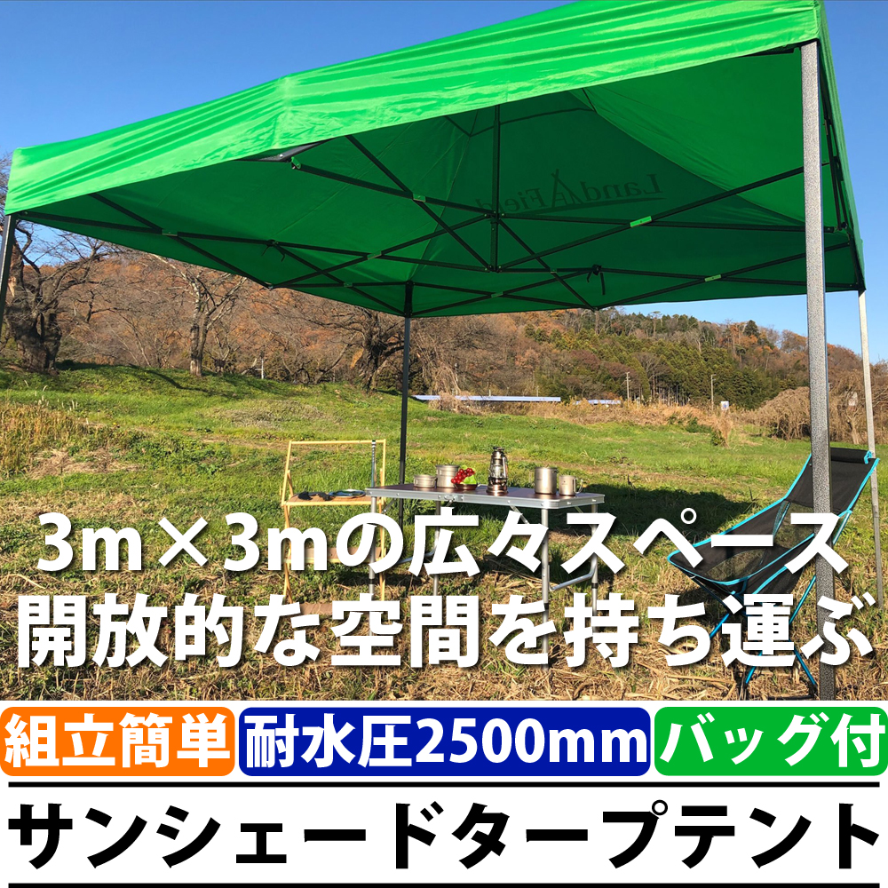 タープテント 3m×3m 高さ調節 高耐水 防水 ポール付き 収納バッグ付き 6人用 天幕テント 頑丈 大型 タープ テント 日よけ 雨よけ サンシェードテント アウトドア 折りたたみ 収納 コンパクト キャンプ LandField