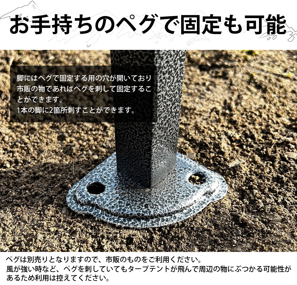 脚にはペグで固定する用の穴が開いており市販の物であればペグを刺して固定することができます。