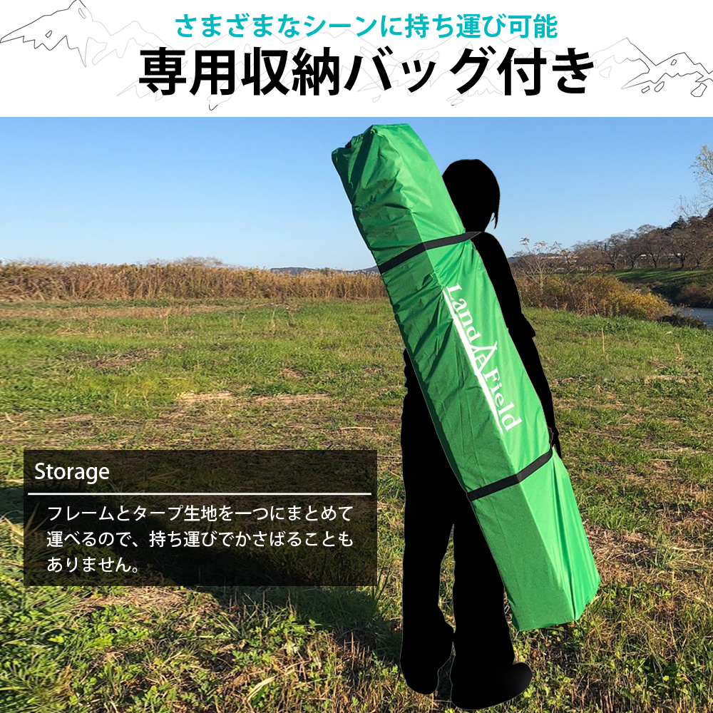 フレームとタープ生地を一つにまとめて運べるので、持ち運びでかさばることもありません。