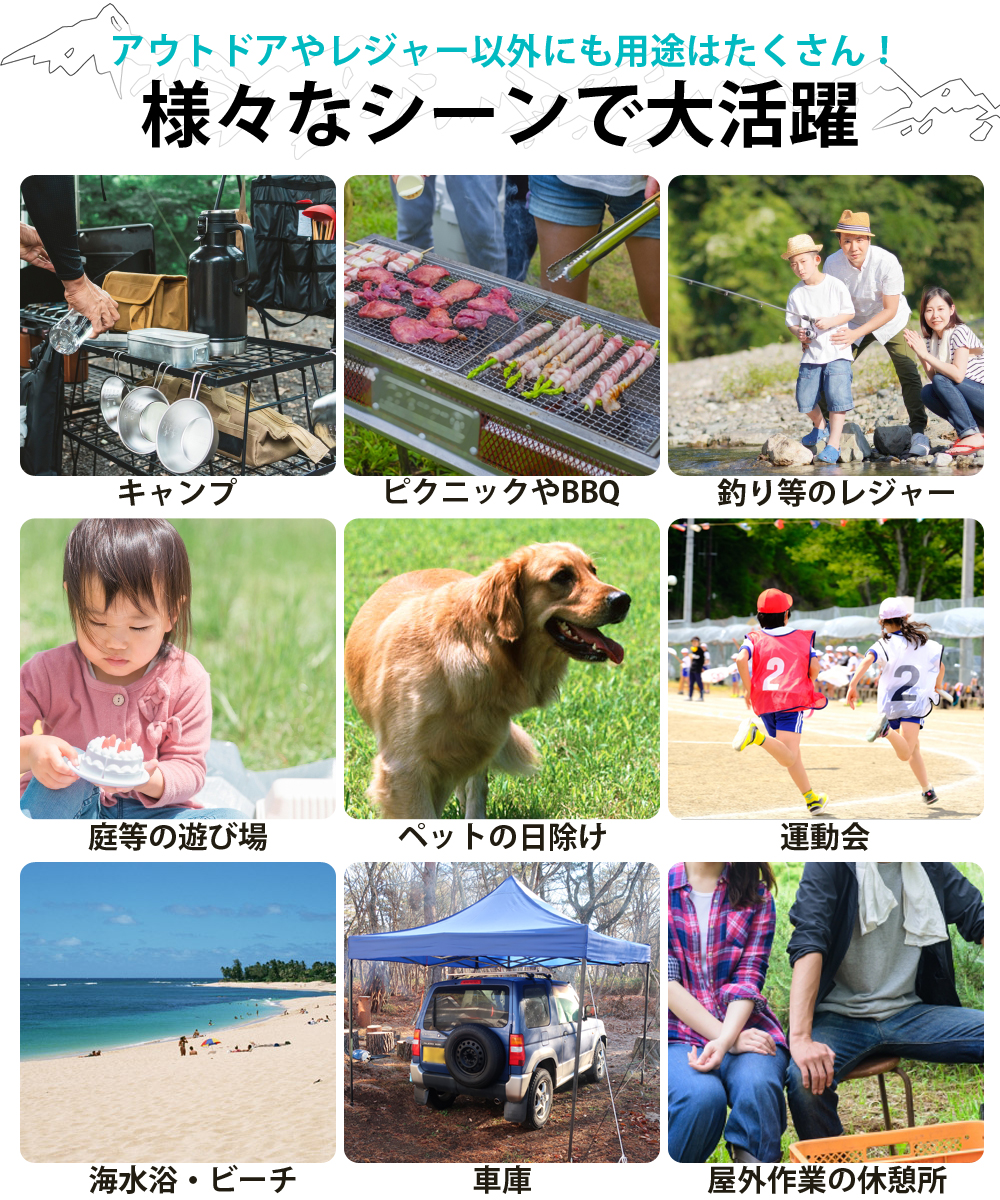 キャンプ・ピクニックやBBQ・釣り等のレジャー・庭等の遊び場・ペットの日除け・運動会・海水浴・ビーチ・車庫・屋外作業の休憩所