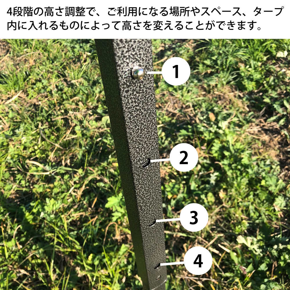 4段階の高さ調整で、ご利用になる場所やスペース、タープ内に入れるものによって高さを変えることができます。